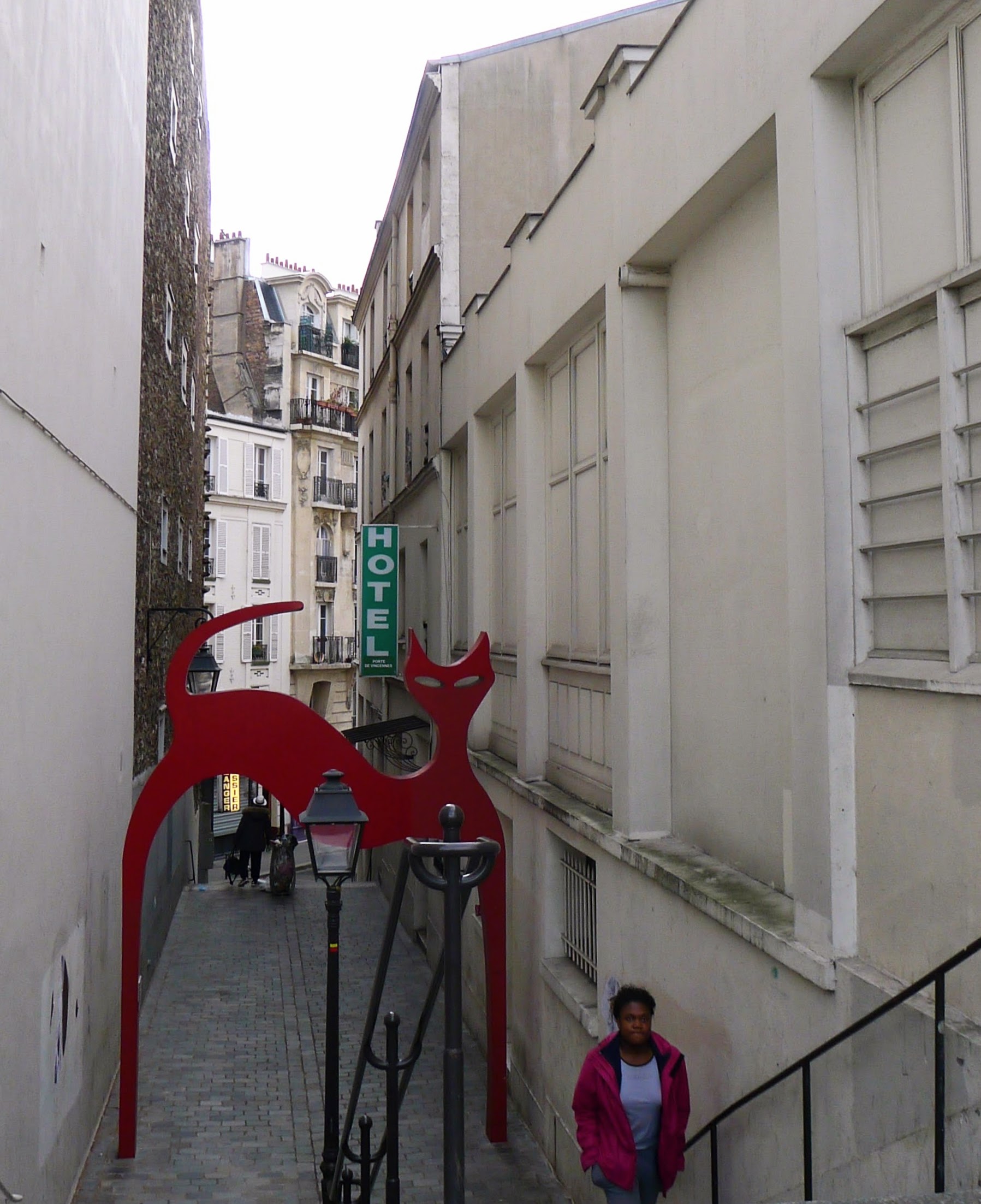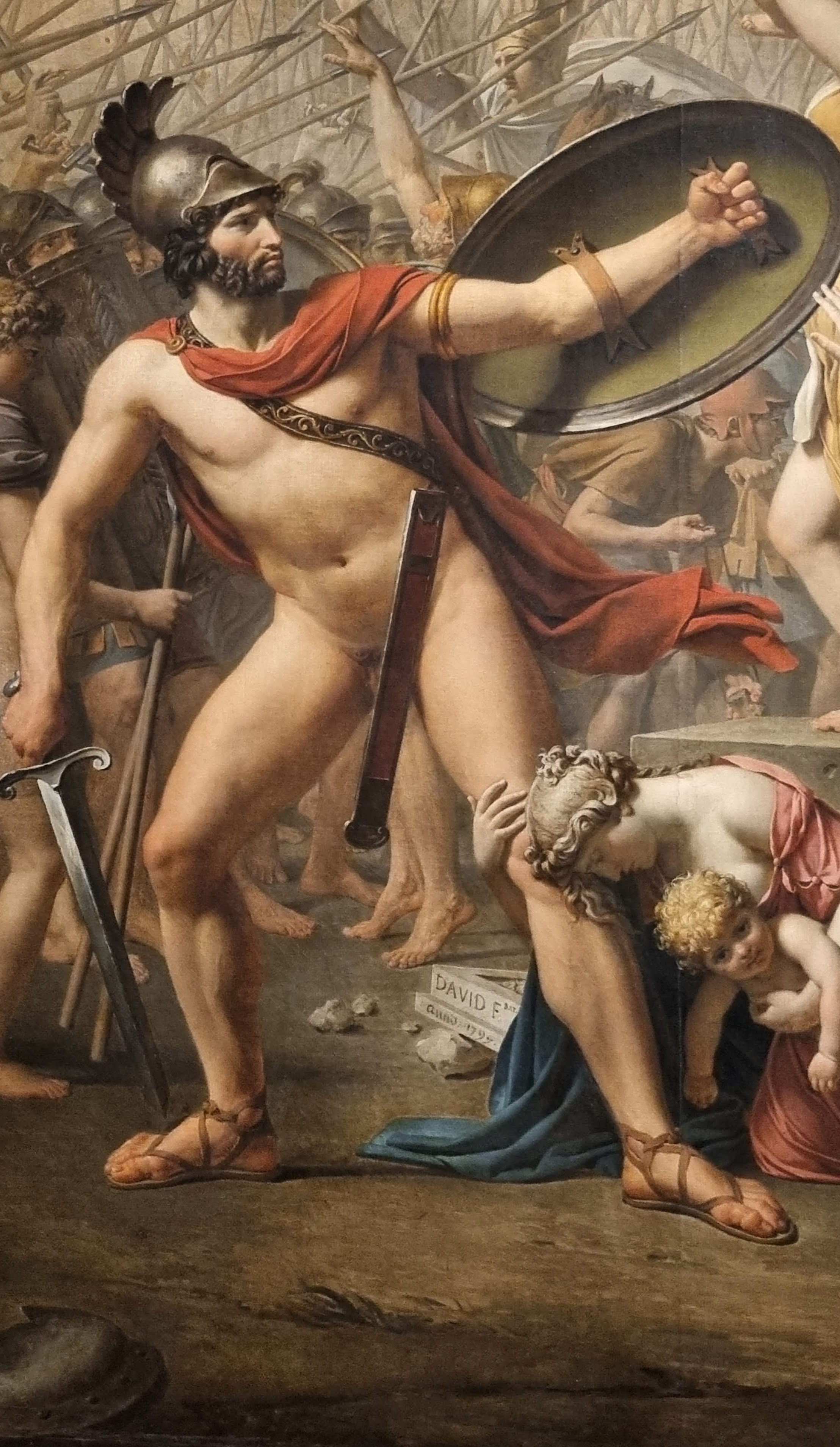 mais je lui préfère la femme habillée de rouge, les bras levés, placée derrière elle, au centre du tableau. Je renonce à m’intéresser à la totalité et j’isole (comme beaucoup) cette figure encadrée par les bras d’Hersilie. Avant même d’en regarder le détail, je perçois la couleur rouge morceau d’émotion et la détermination du regard puisqu’elle est seule à me regarder. La toile m’ennuie un peu : David qui avait admiré les bas-reliefs romains, peint un peu comme s’il dessinait des statues et ses personnages sont étrangement immobiles, figés dans leurs gestes significatifs.