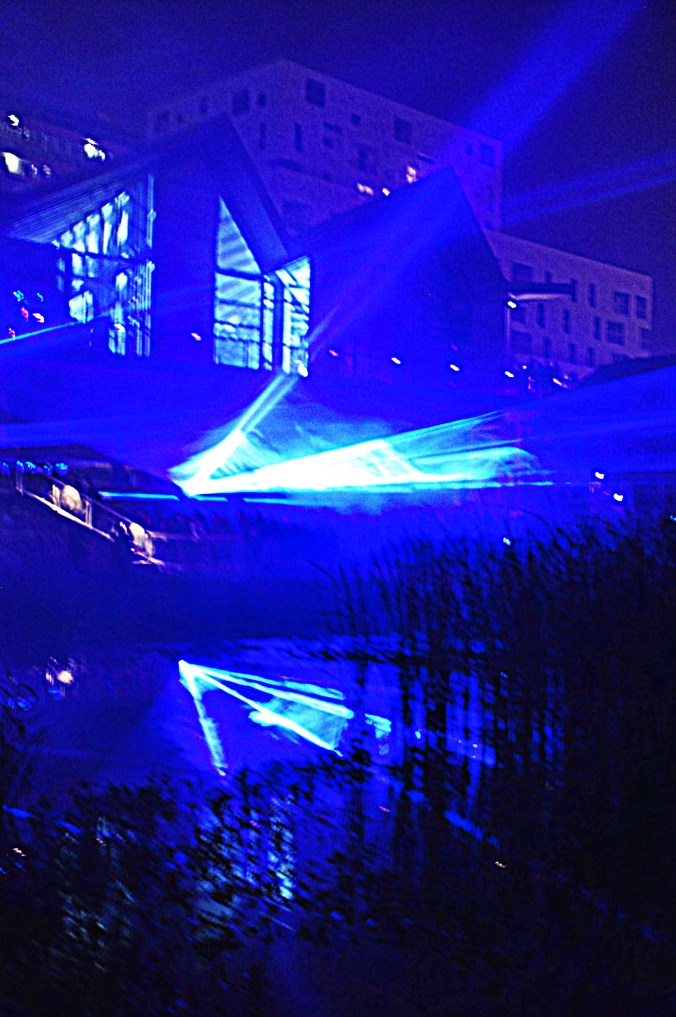 Au parc Martin Luther King, les lasers du Néerlandais Daan Roosegard font onduler une lumière bleue au-dessus des têtes. L’installation a été, paraît-il, imaginée pour donner aux visiteurs le sentiment de marcher sous le niveau de la mer – et avertir du péril de la montée des eaux. Mais, nous n’avons pas ressenti l’angoisse de la fin des temps en voyant la vague bleue aller, venir et se dissoudre dans la brume juste au-dessus de nos têtes ; tantôt des rayons acérés se reflètent dans les eaux d’un petit bassin au milieu des touffes de roseaux qui bruissent ; tantôt ils dessinent les longues silhouettes noires des spectateurs, ou changent en fleurs le feuillage des arbres. Le résultat est poétique, pas immédiatement politique et c’est tant mieux.