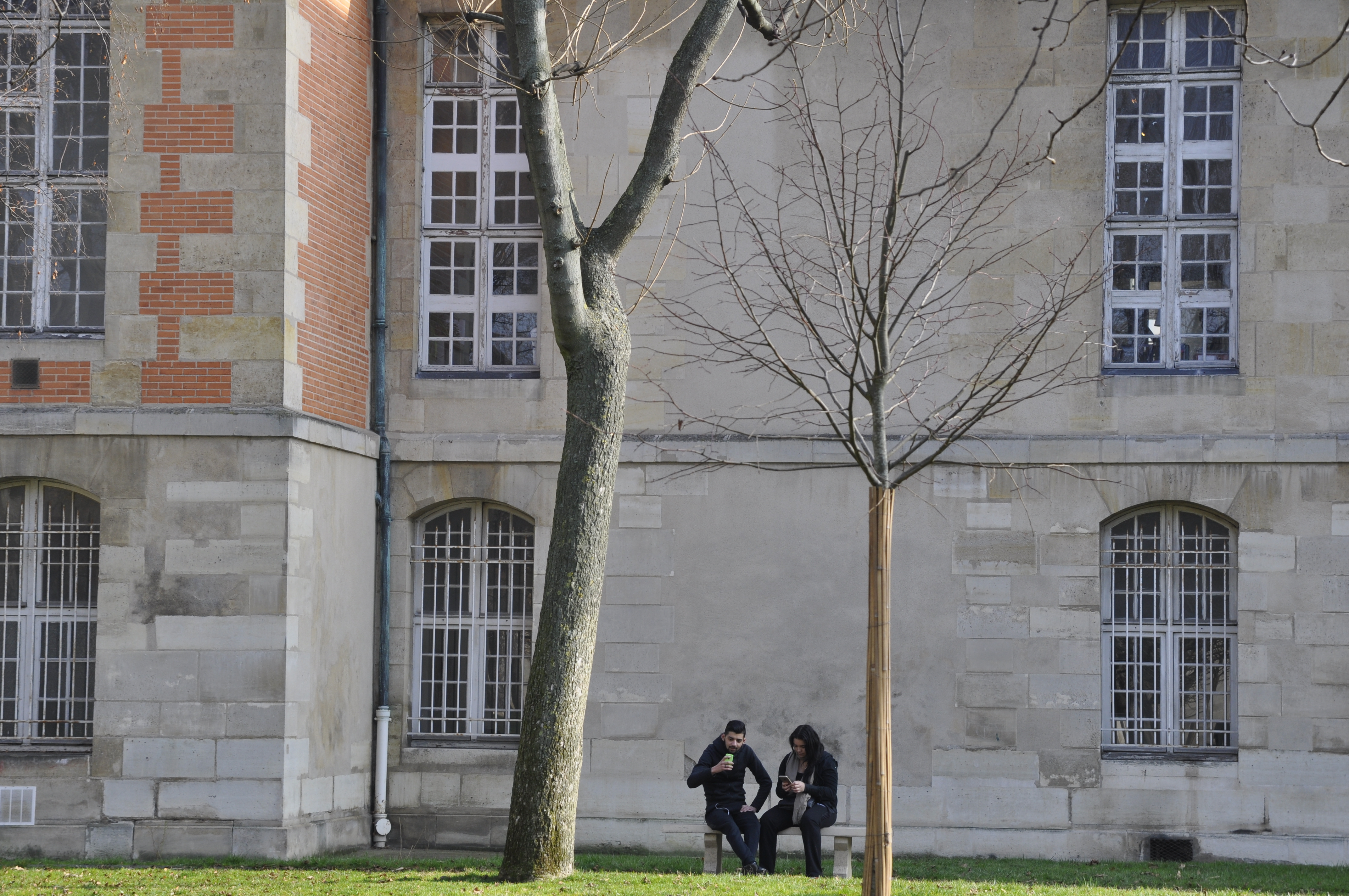 Deux personnes sont venues partager un café au soleil. Elles sont tranquilles sur leur banc. Je remarque leurs portables qui sont comme des emblèmes hyperréalistes venant déplacer un peu l’image classique d’un bâtiment Louis XIII (fenêtres à barreaux,  murs de pierres et de briques,  jardin d’hiver aux ombres douces).