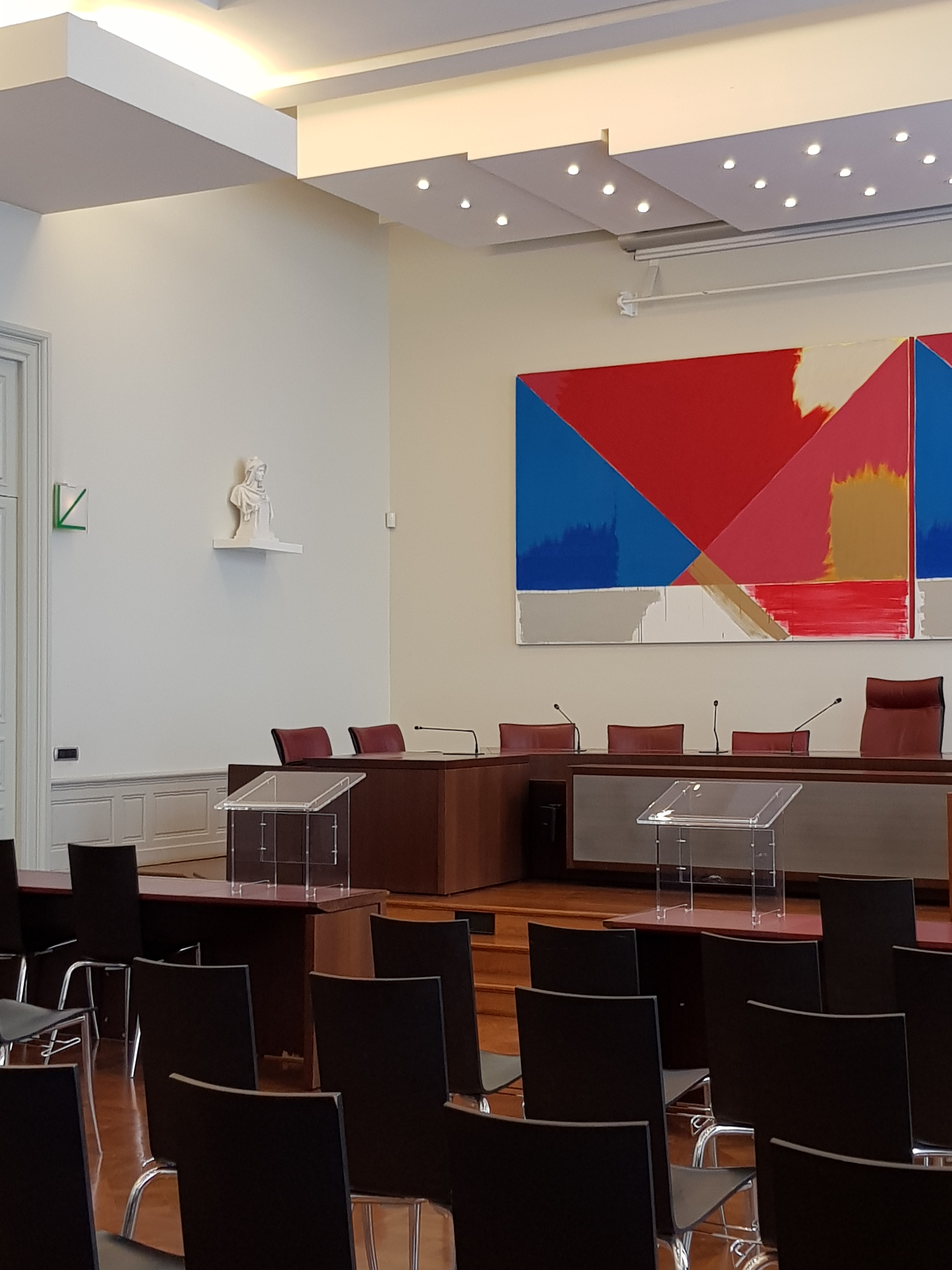 Les décors intérieurs ont disparu. L’appartement principal du premier étage, donnant sur la rue, est occupé par la grande salle du tribunal qu’un président, épris d’art moderne a fait décorer par Bernard Pifarretti.