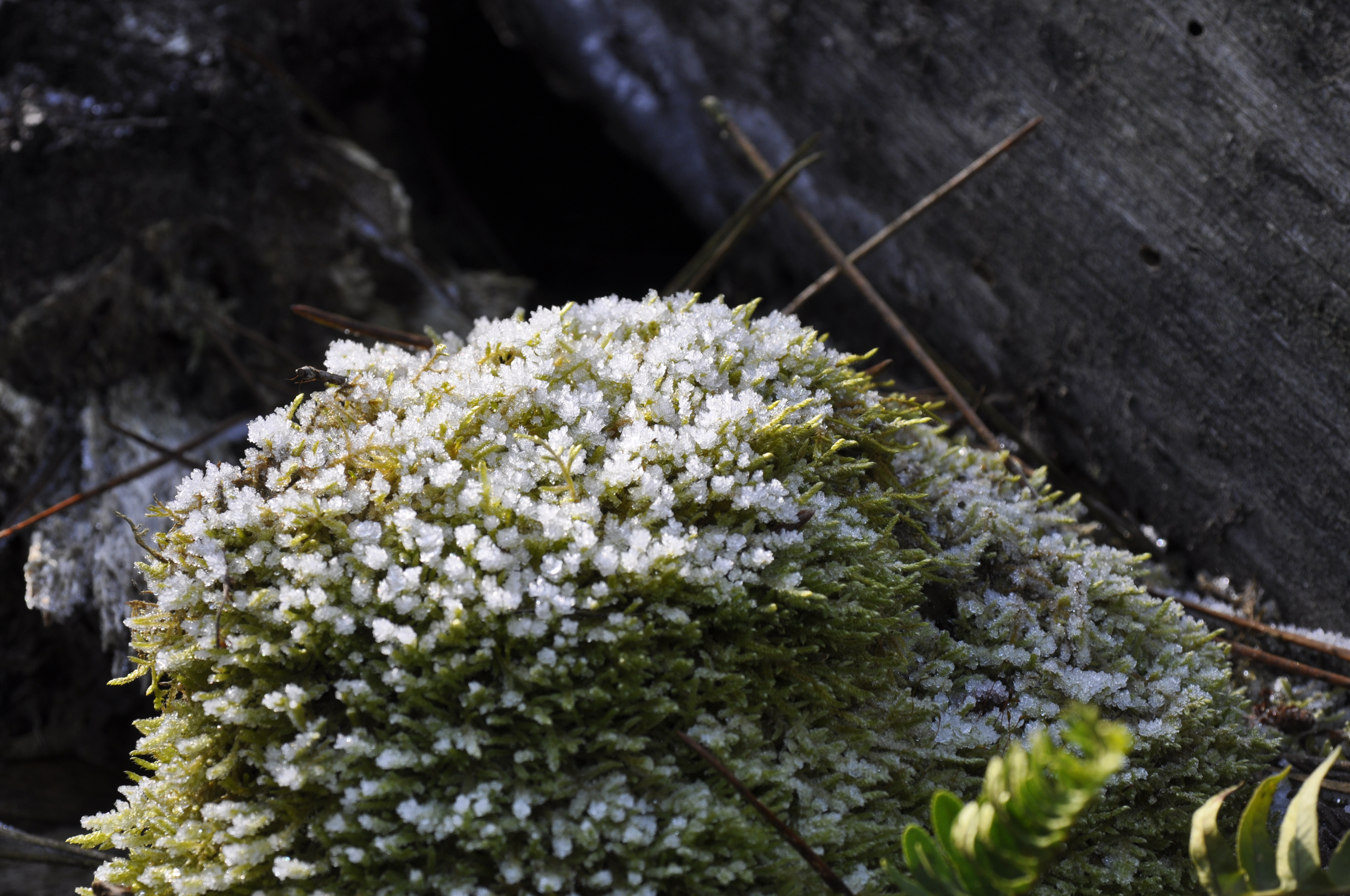 Seules certaines mousses sont restées très vertes avec de petits boutons de grésil qui étincellent.