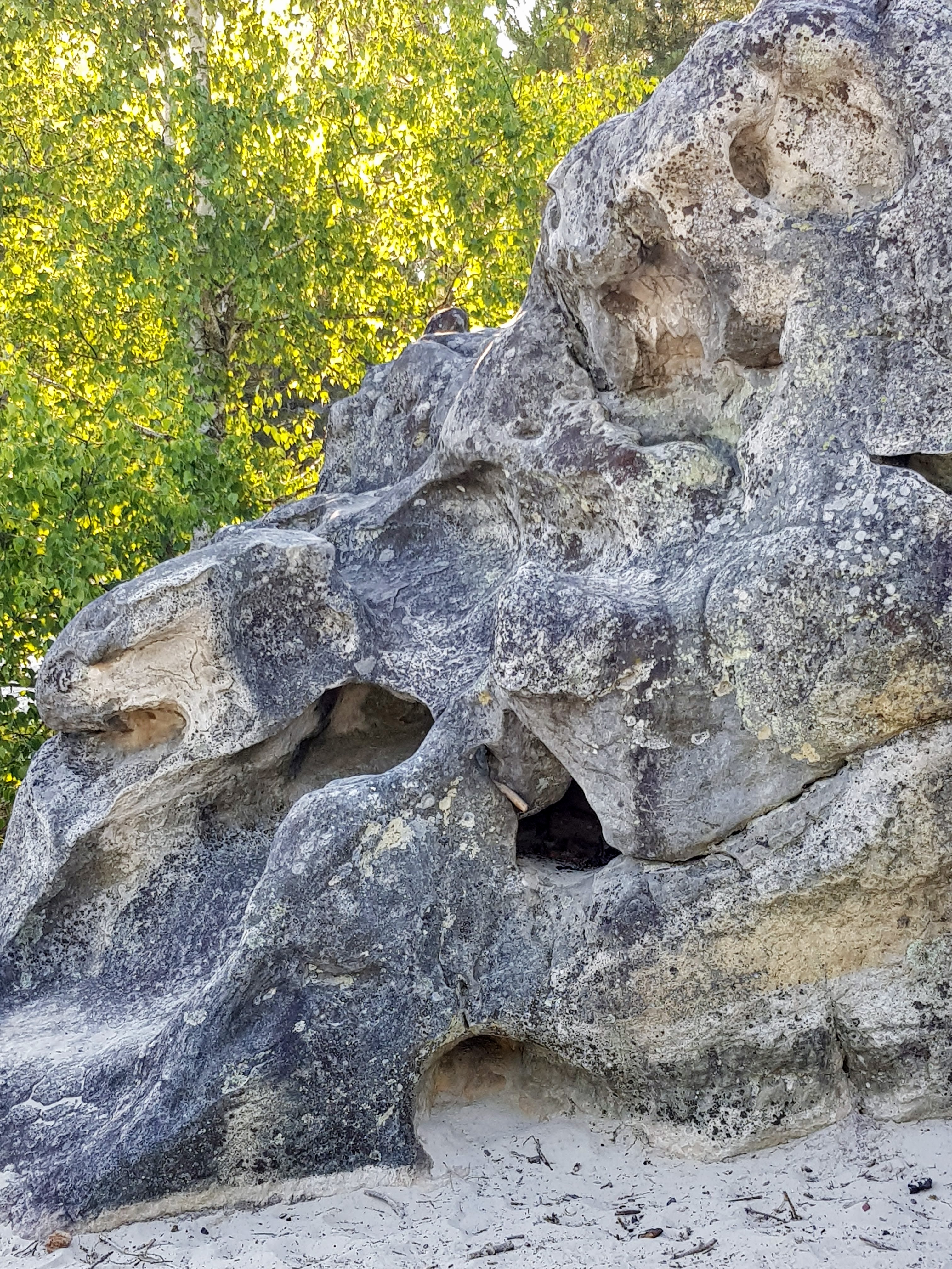 La partie située au Sud-ouest de la forêt de Fontainebleau est la moins fréquentée par les promeneurs. Paradoxalement, c’est peut-être grâce à l’affreuse autoroute A6 qui la sépare du reste du domaine. J’y ai vu des collines pentues et des vallons, des platières désolées, grandes dalles de pierre brisées par le gel et l’eau, et une mer de sable, des rochers d’escalade et des bosses d’entraînement, des landes, des bosquets de bouleaux, quelques châtaigniers et des bouts de forêt méditerranéenne avec des pins et des fougères auxquels ne manquent que le thym et la sarriette.