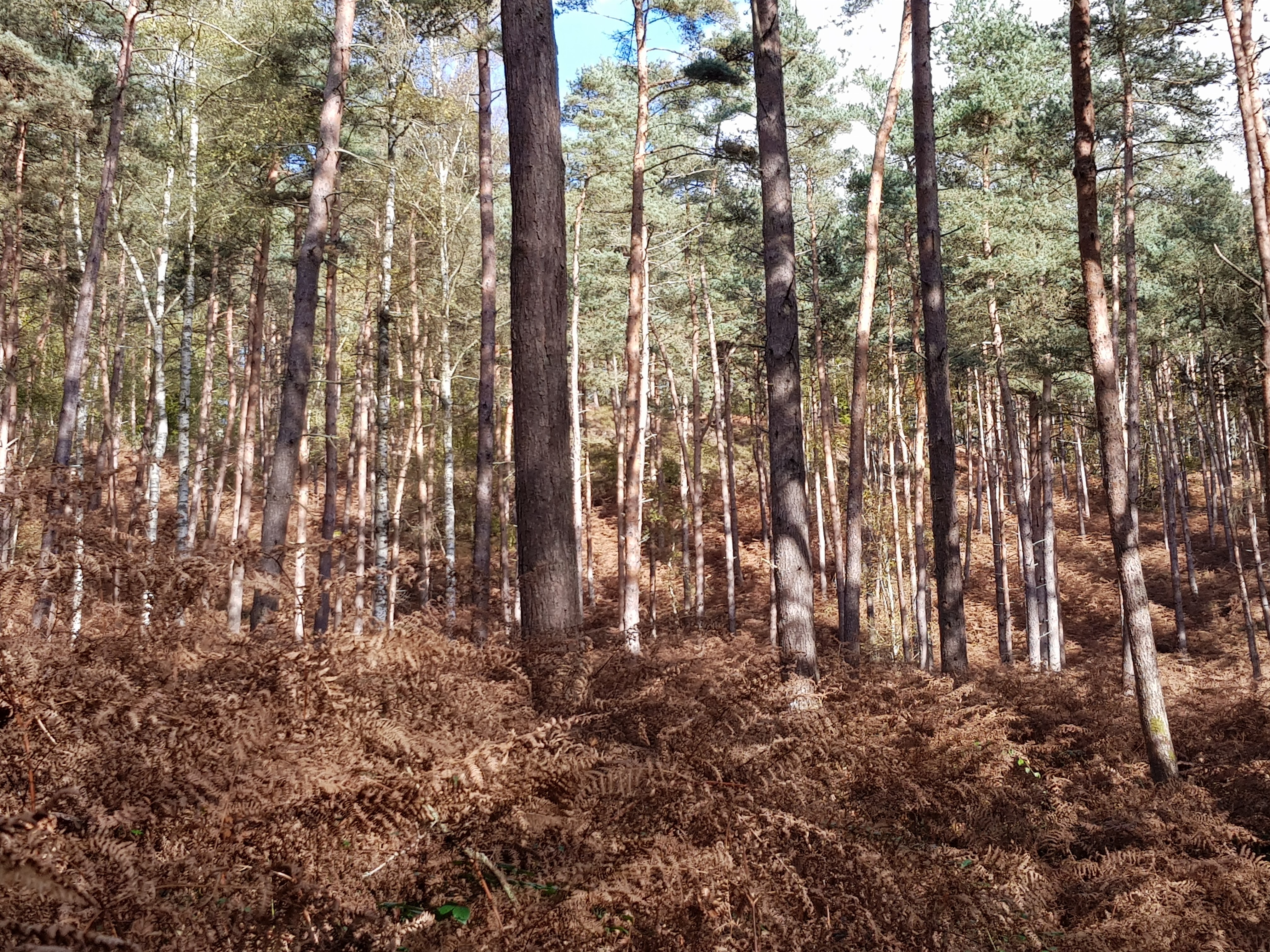 Les sous-bois sont envahis de fougères brûlées par l’automne. De temps à autres des feuilles déjà rougies, mais lumineuses aux rayons du soleil.