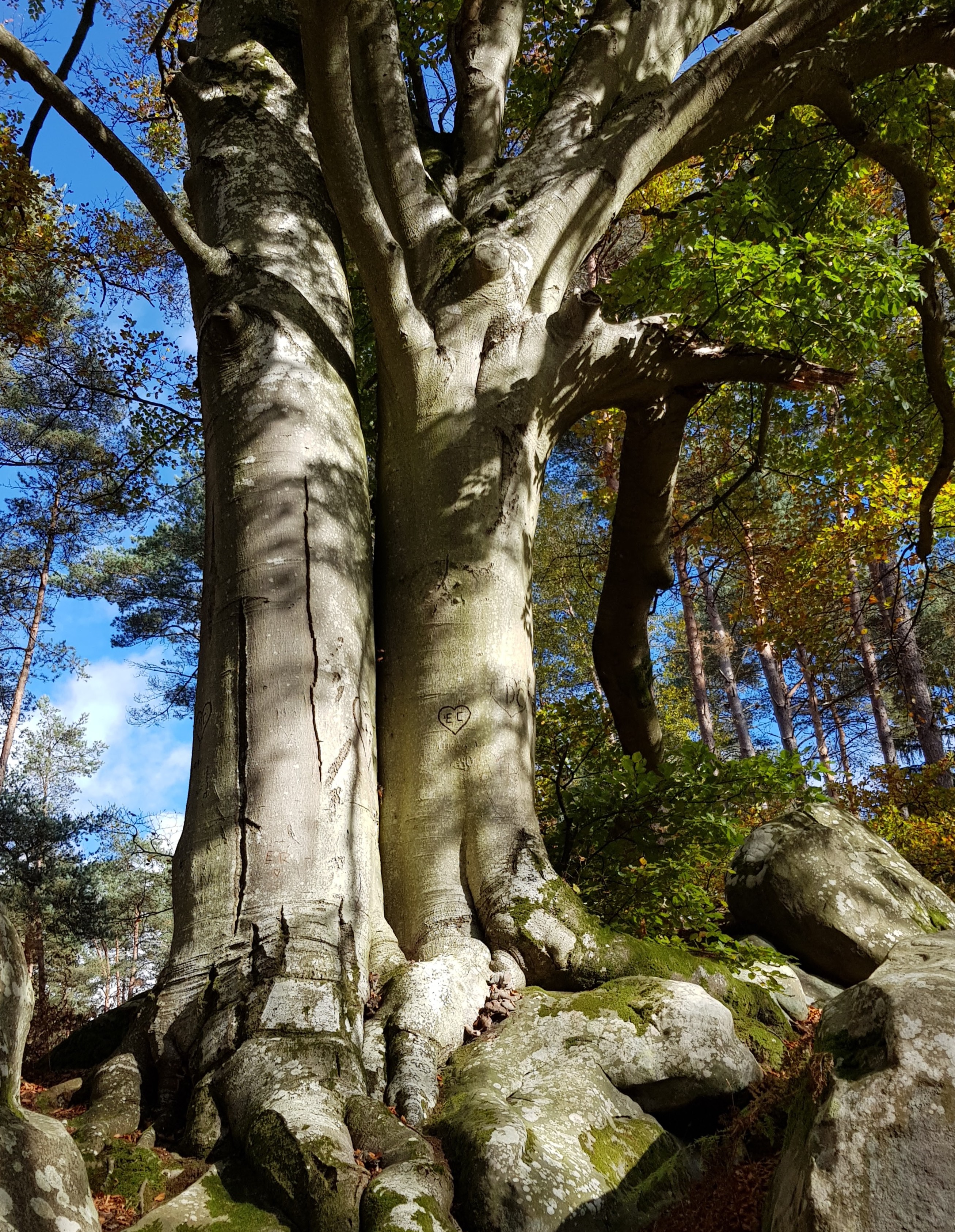 Le chemin forestier enjambe le ru de Cernay qui descend, comme un torrent de montagne, jusqu’au fond de la vallée. Plus loin, les blocs de pierre font leur apparition, accompagnés par les grands hêtres au mouvement de racines si particulier, tournant autour des pierres avant de s’enfoncer sous terre. Ça et là, les amoureux n’ont pu s’empêcher d’entailler les troncs pour imprimer leur marque.