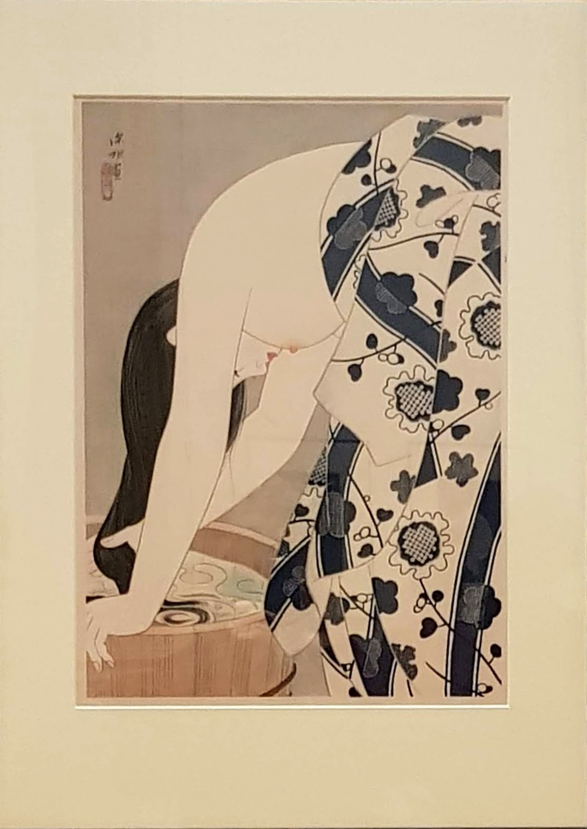 Les cadrages déséquilibrés du même Onchi Koshiro et son goût pour la ligne stylisée rejoignent le travail des avant-gardes européennes. Une des plus belles estampe est Le Plongeon… un trait dans l’espace, l’angle du plongeoir, la clarté de l’air. J’aurais voulu montrer une image, mais les terribles reflets du sous-verre ont brouillé ma photo et je ne sais pas si je suis autorisée à copier les images que l’on trouve sur le site de la fondation.