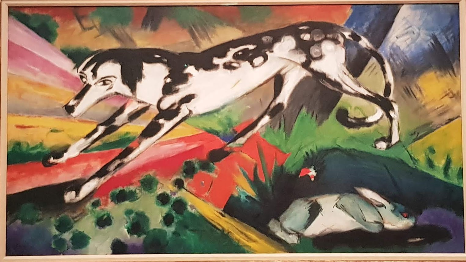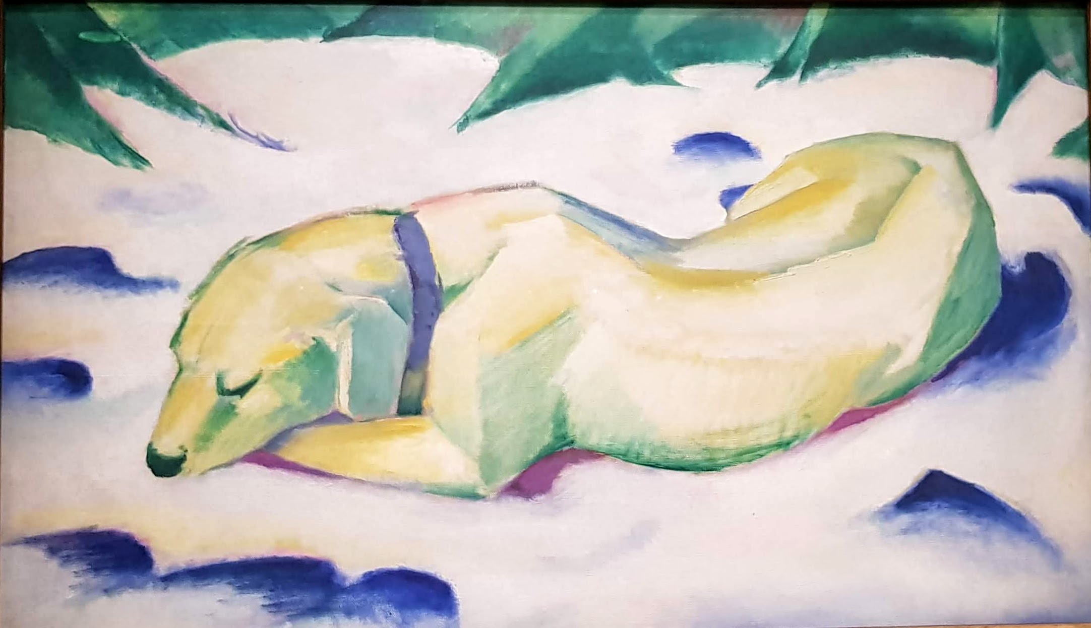 Un chien blanc d’une douceur de peluche est étendu sur une neige éblouissante. Les animaux tournent le dos au spectateur, ou bien ils ferment les yeux, perdus dans un rêve voluptueux. Marc ne se contente pas d’un but spirituel. L’accord entre l’animal et la nature passe par l’arabesque de l’arbre bleu accordée aux courbes du chat, par la blancheur de la neige qui prolonge le blanc du pelage…