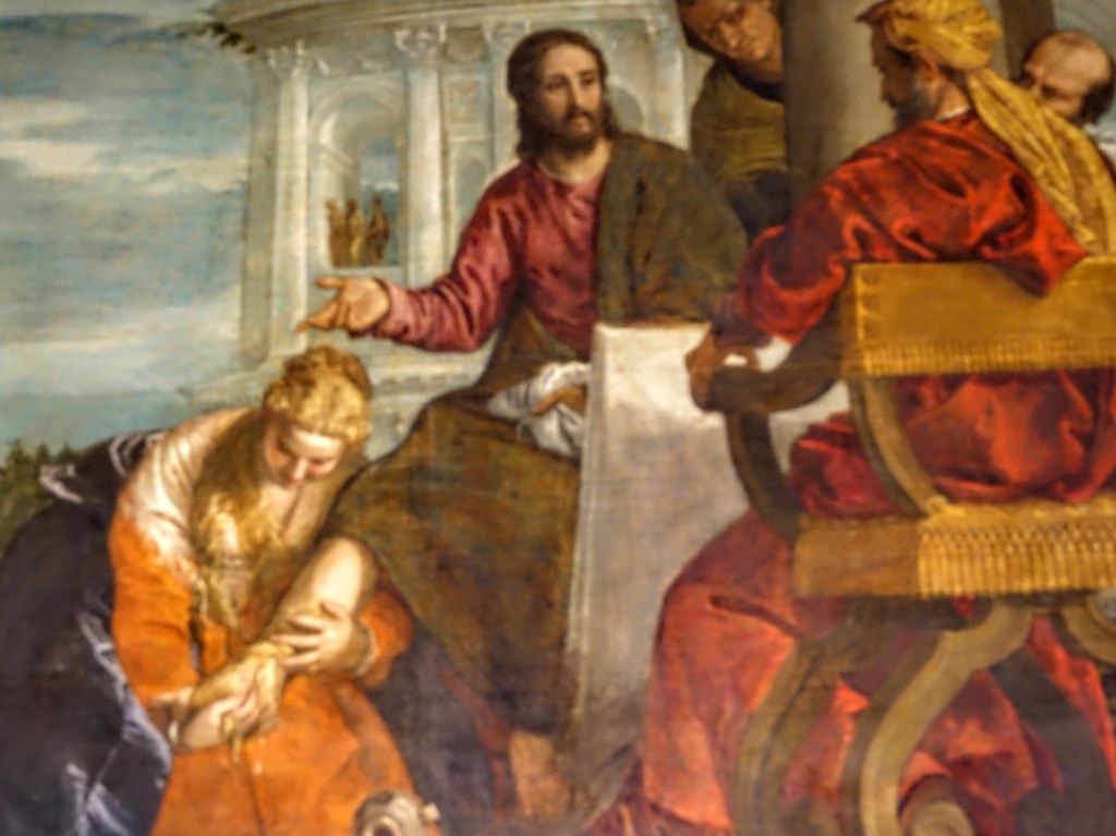 Pourtant Véronèse a donné une chair si lumineuse, une chevelure si voluptueuse à cette Marie penchée sur les pieds du Christ qu’il invite le spectateur aux fantasmes romanesques. J’entends les chuchotements de la pécheresse : « Tu es ma vie, mon amour, mon agneau et mon grand amour. Je chéris ton corps. J’aime jusqu’au dernier de tes orteils. Je voudrais faire l’amour avec toi, sentir le poids de ton corps sur le mien, me perdre dans ton odeur. Je voudrais veiller sur ton sommeil ».