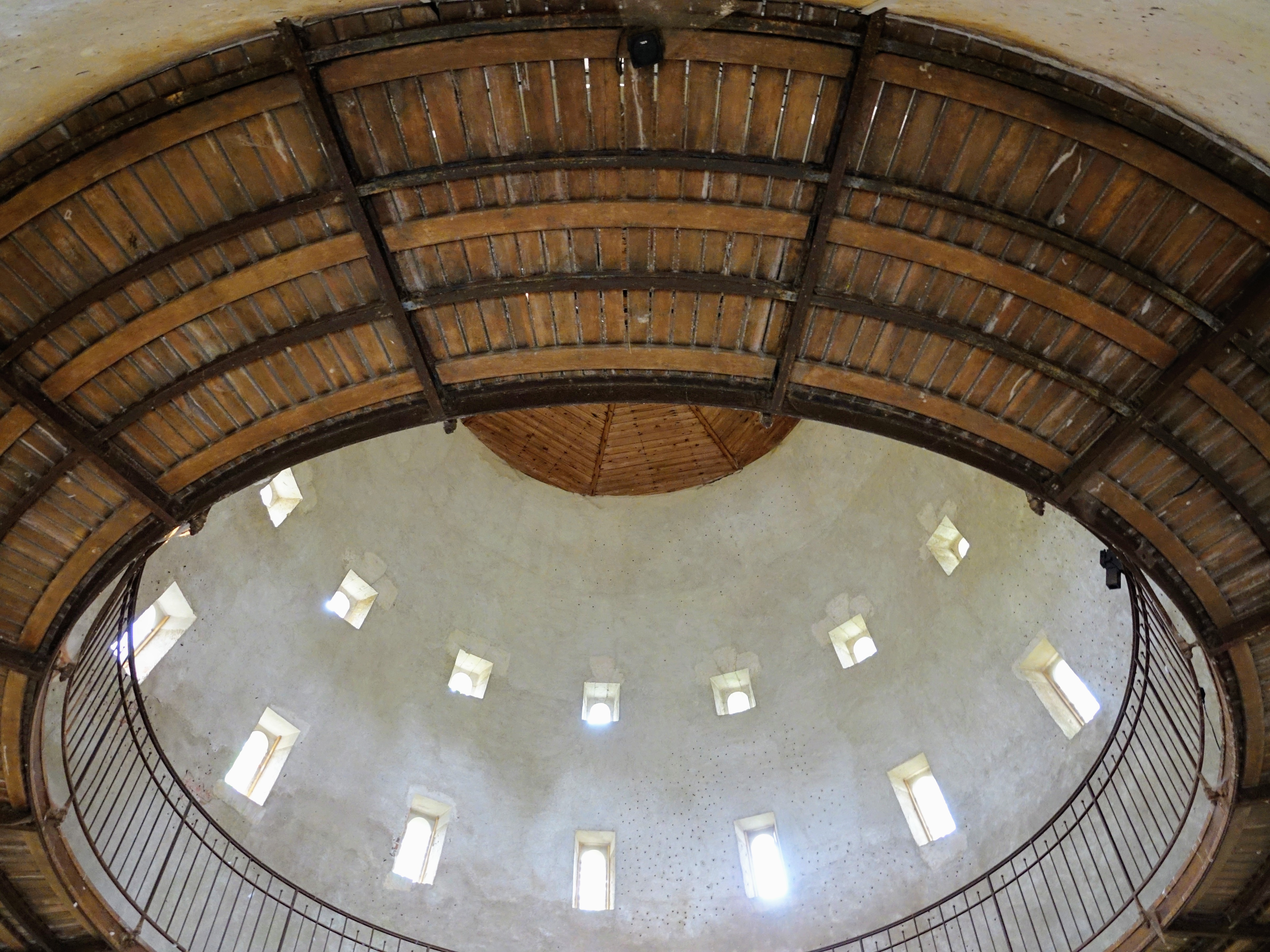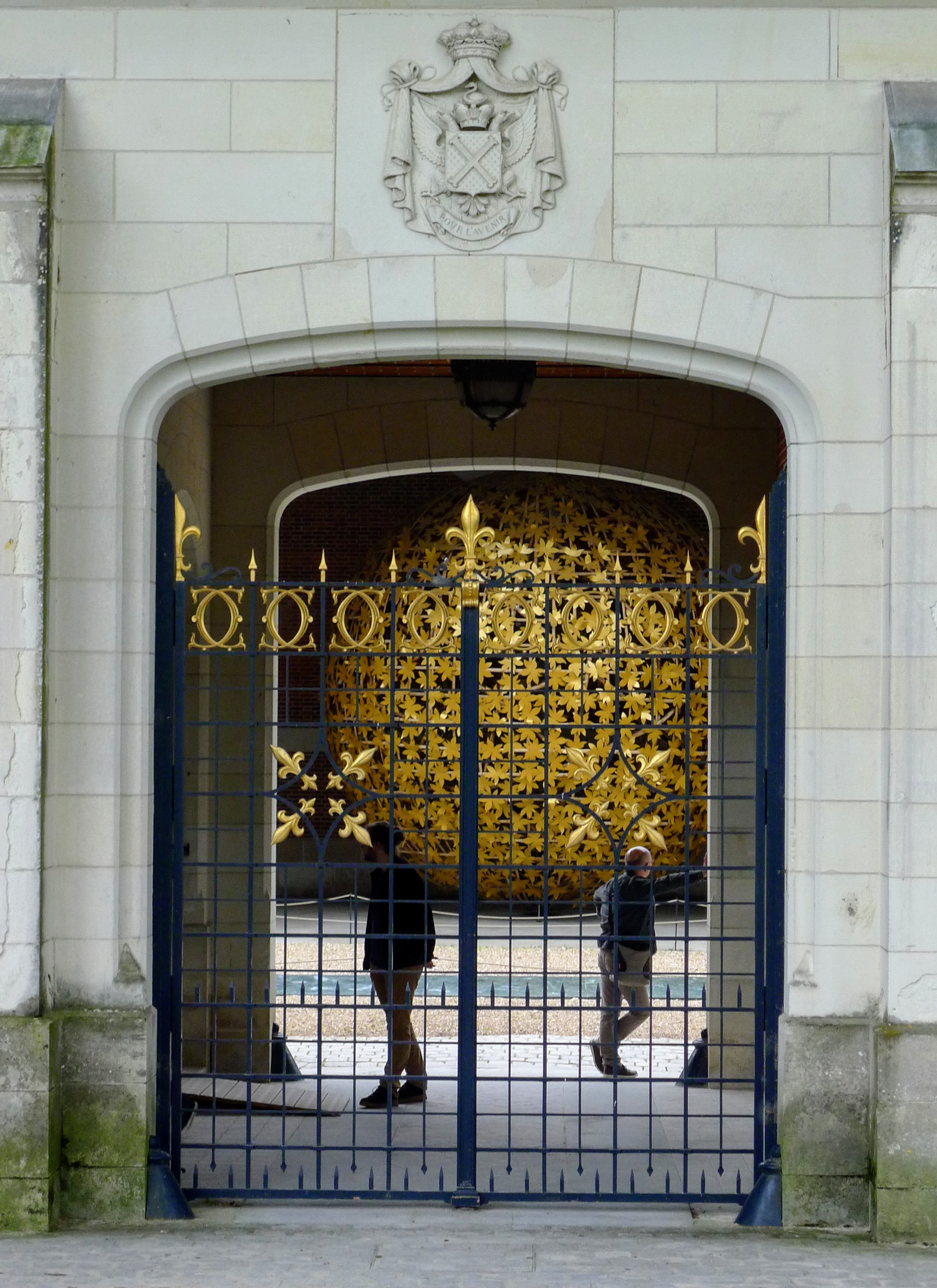 Un coup d’œil aux écuries. A travers la grille, luisent les pointes d’or d’une énorme sphère