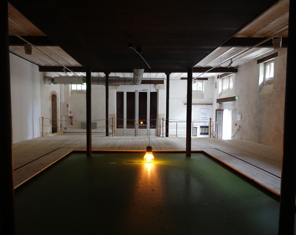 Une grande pièce est plongée dans la pénombre. Au milieu, une piscine couverte de lentilles d’eau. Une ampoule allumée, accrochée juste au-dessus des lentilles, se déplace au hasard. Tout se fait en silence. On suit des yeux la lumière orange qui avance lentement en rayant à peine la pellicule végétale, trace un chemin noir, une ligne de vie. Peu après le passage de l’ampoule, l’eau redevient lisse. Il semble qu’il n’y ait rien à interpréter. Juste rester là, s’imprégner de l‘impression légèrement angoissante qu’on assiste à un dialogue entre le visible et l’invisible (le temps ?)
