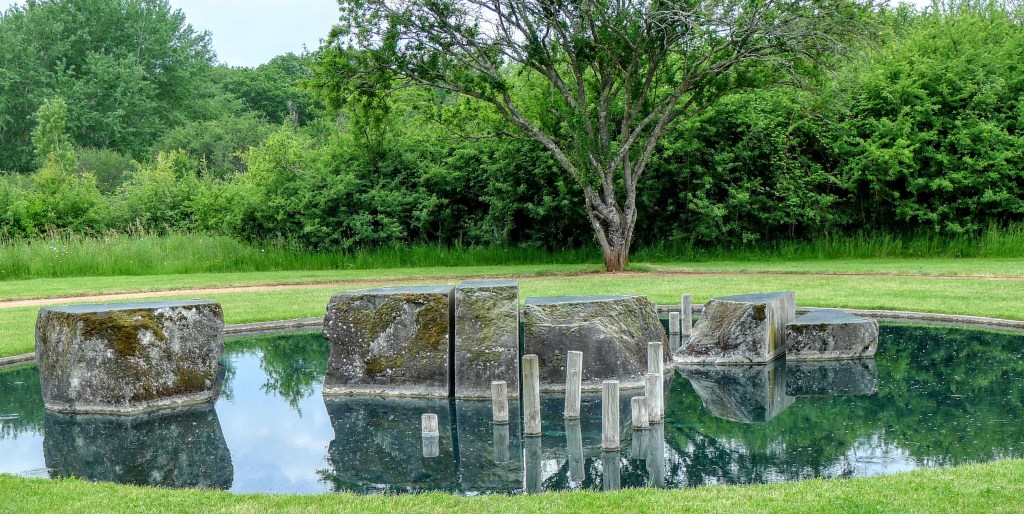 Le lieu invite à rester là, tranquille, devant l’eau trouble où se reflètent des arbres selon les heures. Le regard va des blocs des pierres disjointes, en train de se fragmenter (combien de siècles seront nécessaires ?), aux poteaux de bois fichés dans l’eau, à l’entrelacs des branches. On a fait taire les téléphones portables, l’incessante circulation des nouvelles ; on se contente de s’imprégner de la coexistence de l’eau, du bois, de l’arbre et on pense à leur rythme de vie différents.