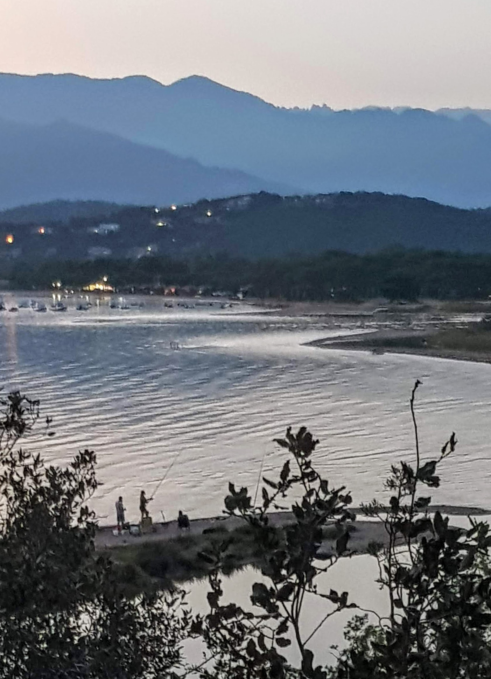 Avant que l’ombre ne gagne tout, ce moment émouvant de la fin du jour avec les vagues sombres des montagnes et deux silhouettes noires de pêcheurs. L’alliance du proche et du lointain.