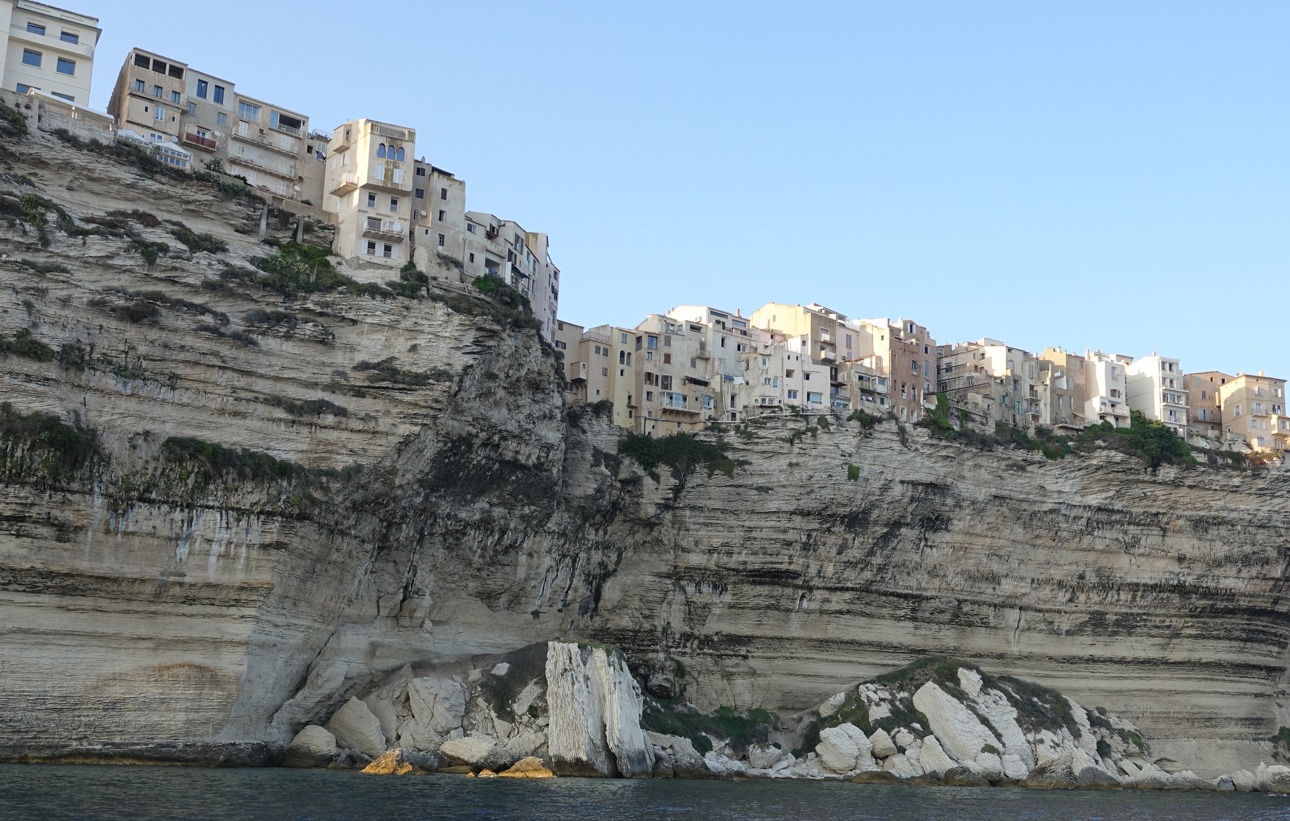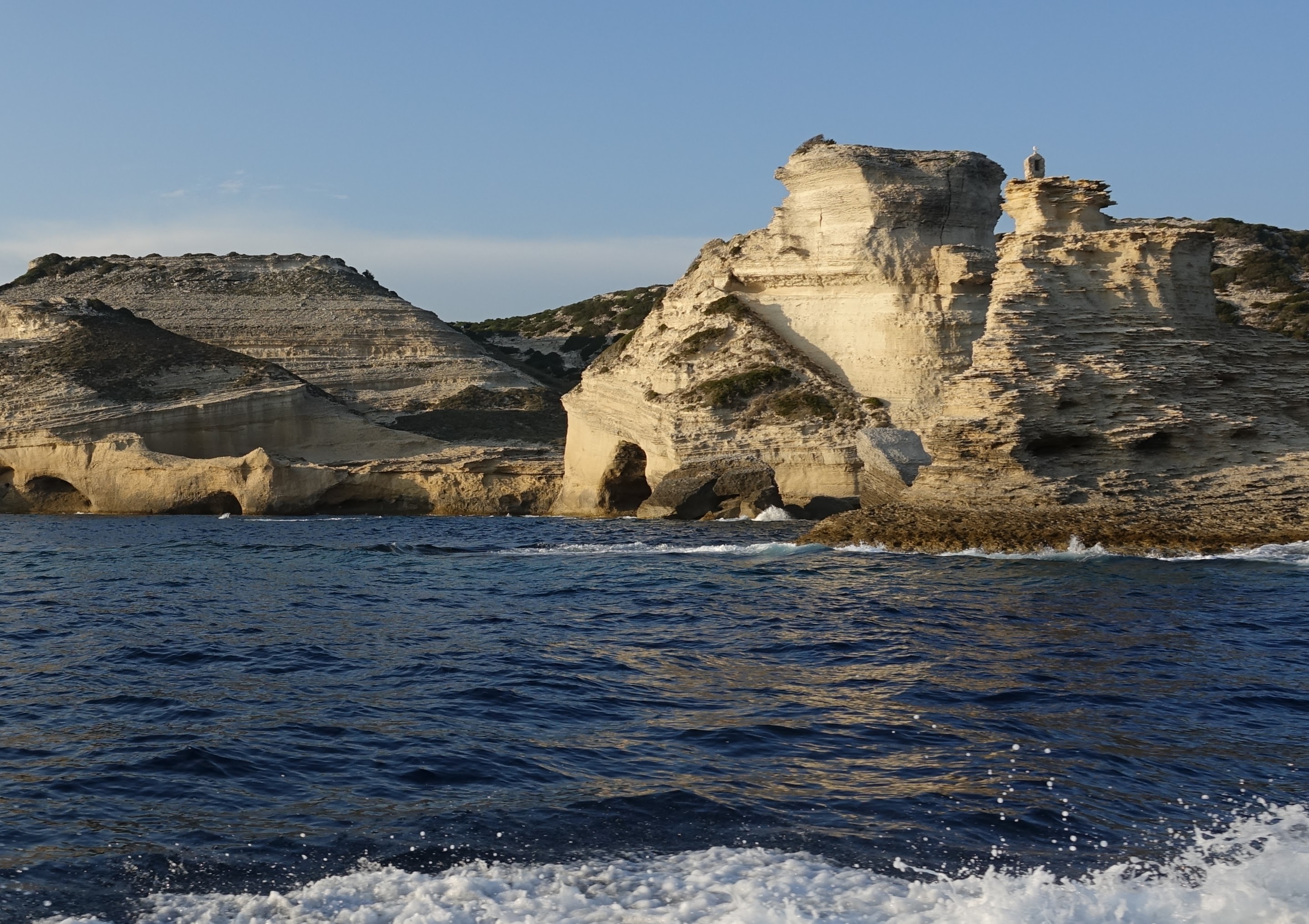 Nous avons ensuite navigué jusqu’à la côte et le long des falaises jusqu’à Bonifacio, longeant les incroyables falaises de calcaire, étincelantes sous le soleil. La mer bouillonnait au passage du bateau. Sur une des crêtes, on voyait l’oratoire qui marque la pointe sud de la Corse.