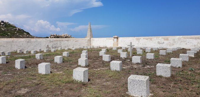 Dans un coin de l’île, deux cimetières où reposent les corps de de marins et de soldats. Ils étaient près de 700 en route pour la Crimée. Renonçant à doubler la Sardaigne par le sud pour cause de mauvais temps, le capitaine voulut passer par les bouches de Bonifacio, un des endroits les plus dangereux de la Méditerranée, des récifs, un goulet étroit (la Sardaigne est à moins de 10 kilomètres), balayé par des vents plus de 300 jours par an. Le trois-mâts se fracassa sur les récifs de l’archipel. Pas un marin, pas un soldat n’en réchappa. 560 cadavres sans visage et sans nom, à l’exception du capitaine et de l’aumônier identifiés grâce à son uniforme pour le premier et à son étole pour le second. Une centaine d’autres marins furent, eux, à jamais engloutis. « Qu’il était triste le cimetière de la Sémillante !, écrivit Daudet. Je le vois encore avec sa petite muraille basse, sa porte de fer, rouillée, dure à ouvrir, sa chapelle silencieuse, et des centaines de croix noires cachées par l’herbe… Pas une couronne d’immortelles, pas un souvenir ! rien… Ah ! les pauvres morts abandonnés, comme ils doivent avoir froid dans leur tombe de hasard ! » ( « L’agonie de la Sémillante » Les Lettres de mon moulin)