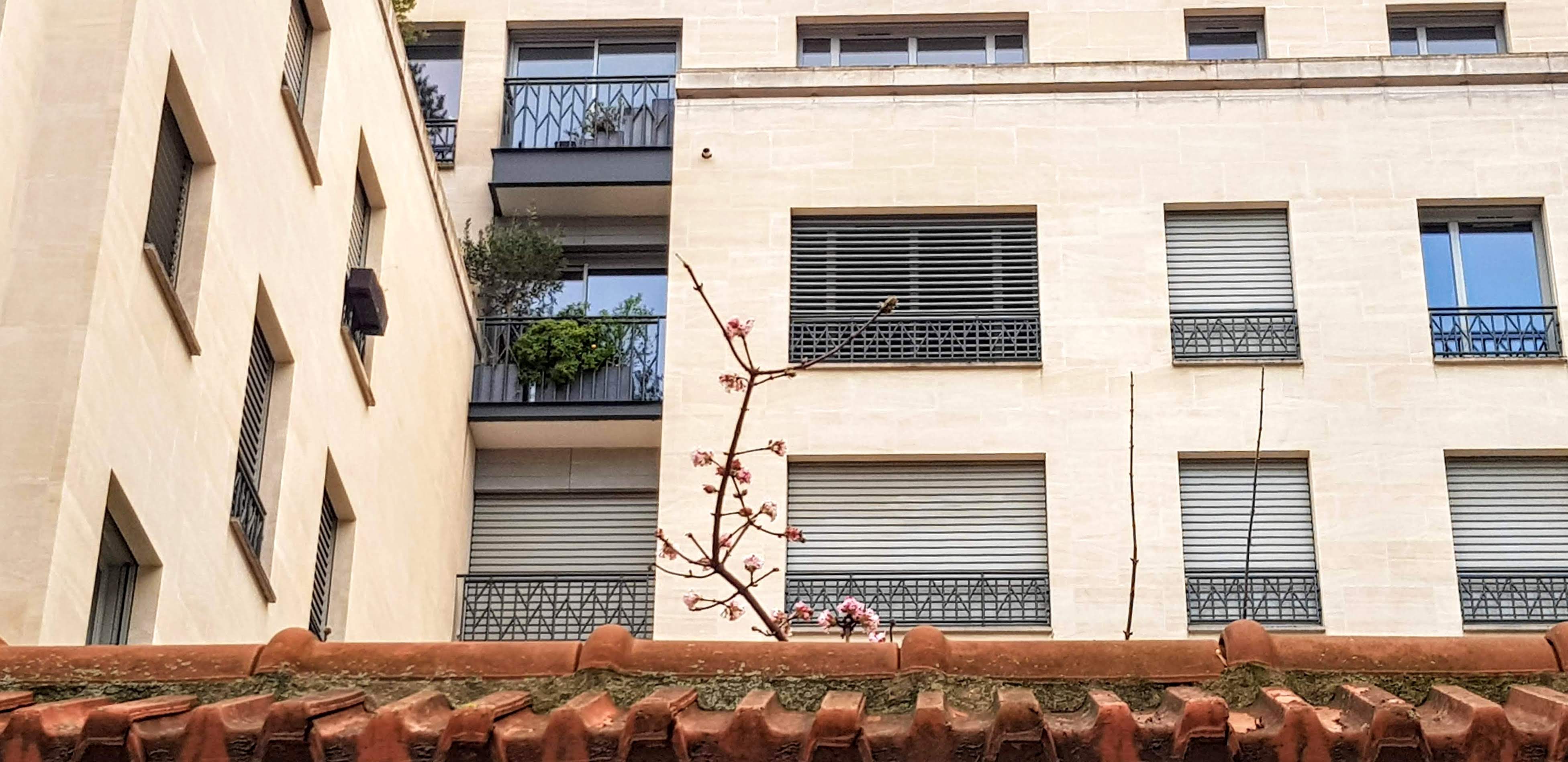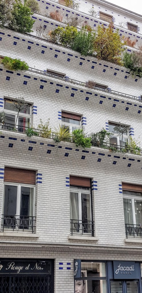 Au 26 de la rue Vavin, nous admirons, l’immeuble en gradins carrelé de blanc et de bleu, conçu par Henri Sauvage et Charles Sarrazin pour faire entrer l’air et la lumière dans des appartements destinés aux ouvriers. (Au 13 rue des Amiraux dans le 18e arrondissement, à la fin des années 20, les architectes ont suivi le même modèle et ils ont réussi à installer une piscine, la célèbre piscine des Amiraux). Un matériau résistant, d’entretien facile (la pluie le lave !), aurait dû faire le succès de la formule. Seulement, plus les étages montaient, moins le nombre de mètres carrés disponibles était important. Les actionnaires ont réalisé que leur profit ne serait pas important. Ils ont enterré le projet de Sauvage et ce sont les bourgeois qui achetèrent des appartements où il était possible d’installer des jardins suspendus. Ce 17 janvier, Roger nous signale qu’un appartement du premier étage vient d’être mis en vente, au prix de 2 850 000 euros (Agence Vaneau Luxembourg).