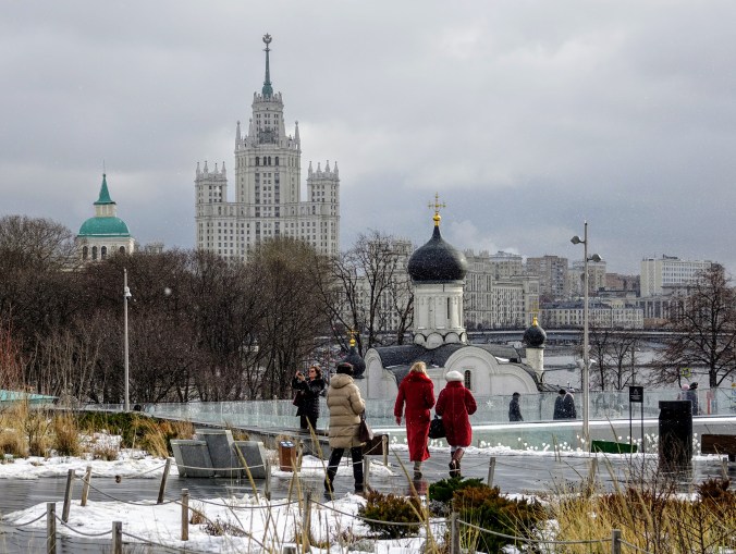 Le temps s’est éclairci quand nous arrivons au parc, ouvert à l’occasion du 870e anniversaire de la capitale. Il est situé à côté de la place Rouge, sur le quai de la Moscova et il s’étend sur plus de dix hectares, à la place de l’ancien hôtel Rossia – un hôtel qui pouvait héberger 5 300 personnes conformément au gigantisme des années d’après-guerre. Le jardin qui lui a succédé abrite une grotte de glace, des restaurants, une salle de concert et un amphithéâtre à ciel ouvert. Un pont en forme de boomerang surplombe la rivière Moskova.