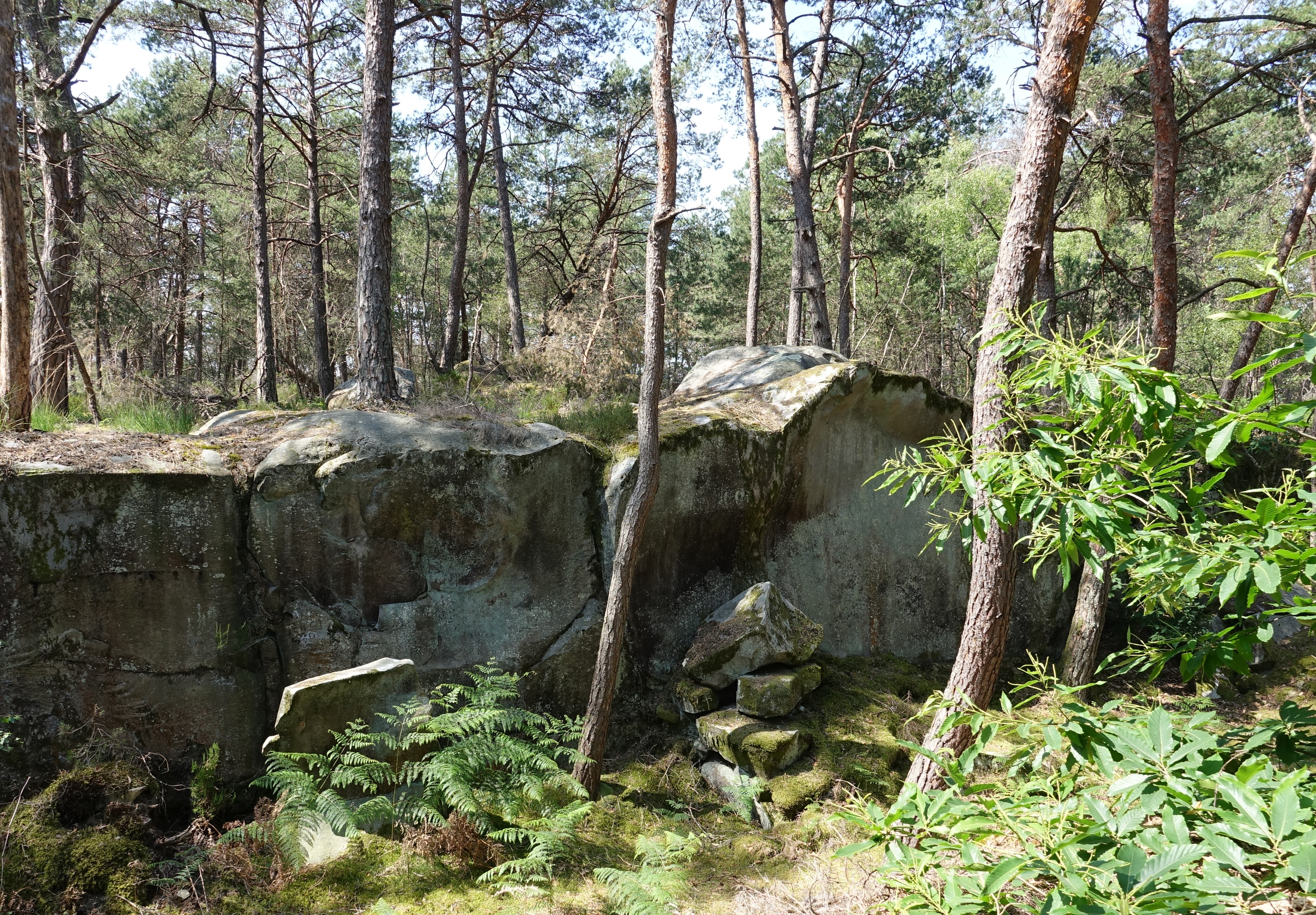 Près du grand point de vue du Cassepot, nous traversons d’anciennes carrières de grès qui rappellent qu’avant de devenir un haut lieu touristique Fontainebleau faisait vivre toute une population de carriers.