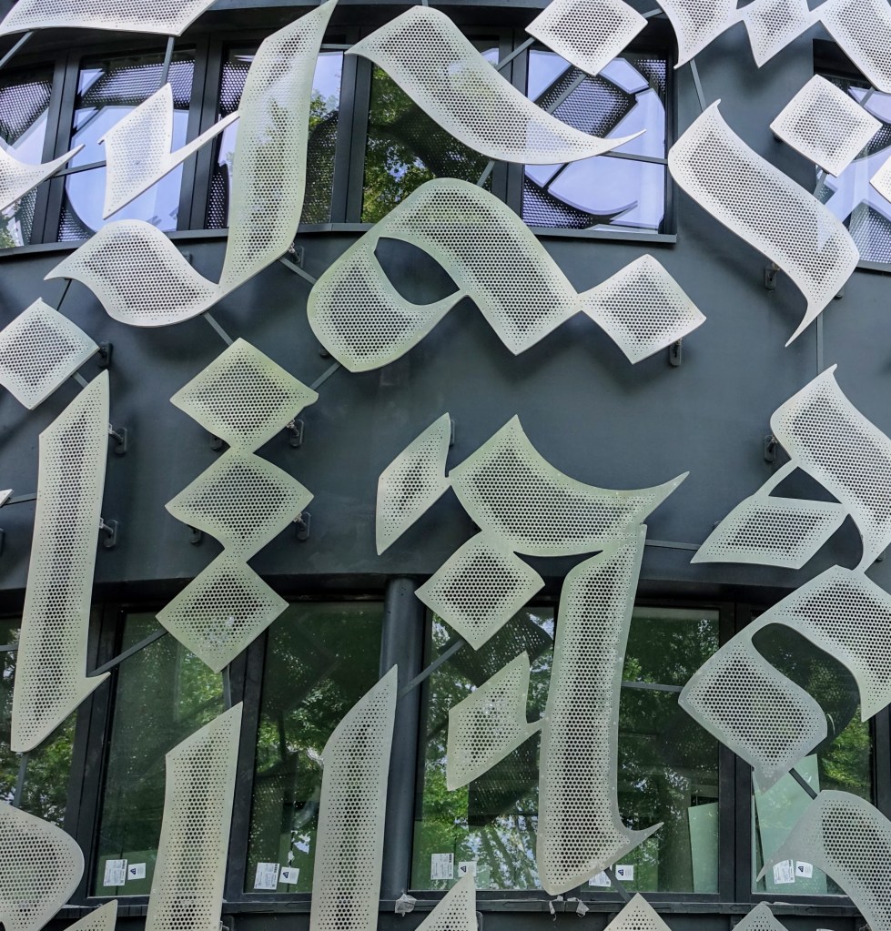 L’histoire continue. Au bout du parc s’achève la maison de la Tunisie. Deux artistes tunisiens, le calligraphe Shoof et le designer Wissem Soussi. l’ont habillée de lettres arabes
