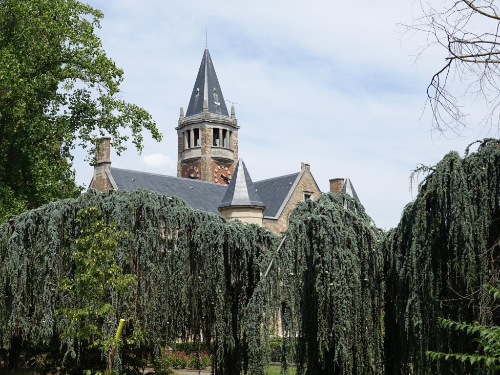 Le beffroi et l’arrière de la fondation un peu dissimulé par un cèdre pleureur