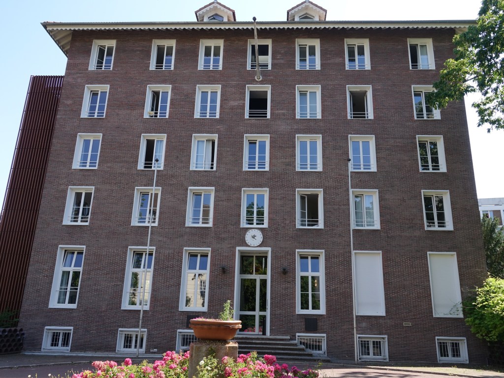 Des échauguettes décorées de fenêtres à meneaux donnent aux 7 bâtiments disposés autour d’un jardin intérieur un style néo-médiéval, qui s’accommode très bien de la couleur brun-rouge des briques et des vélos écolo des étudiants.