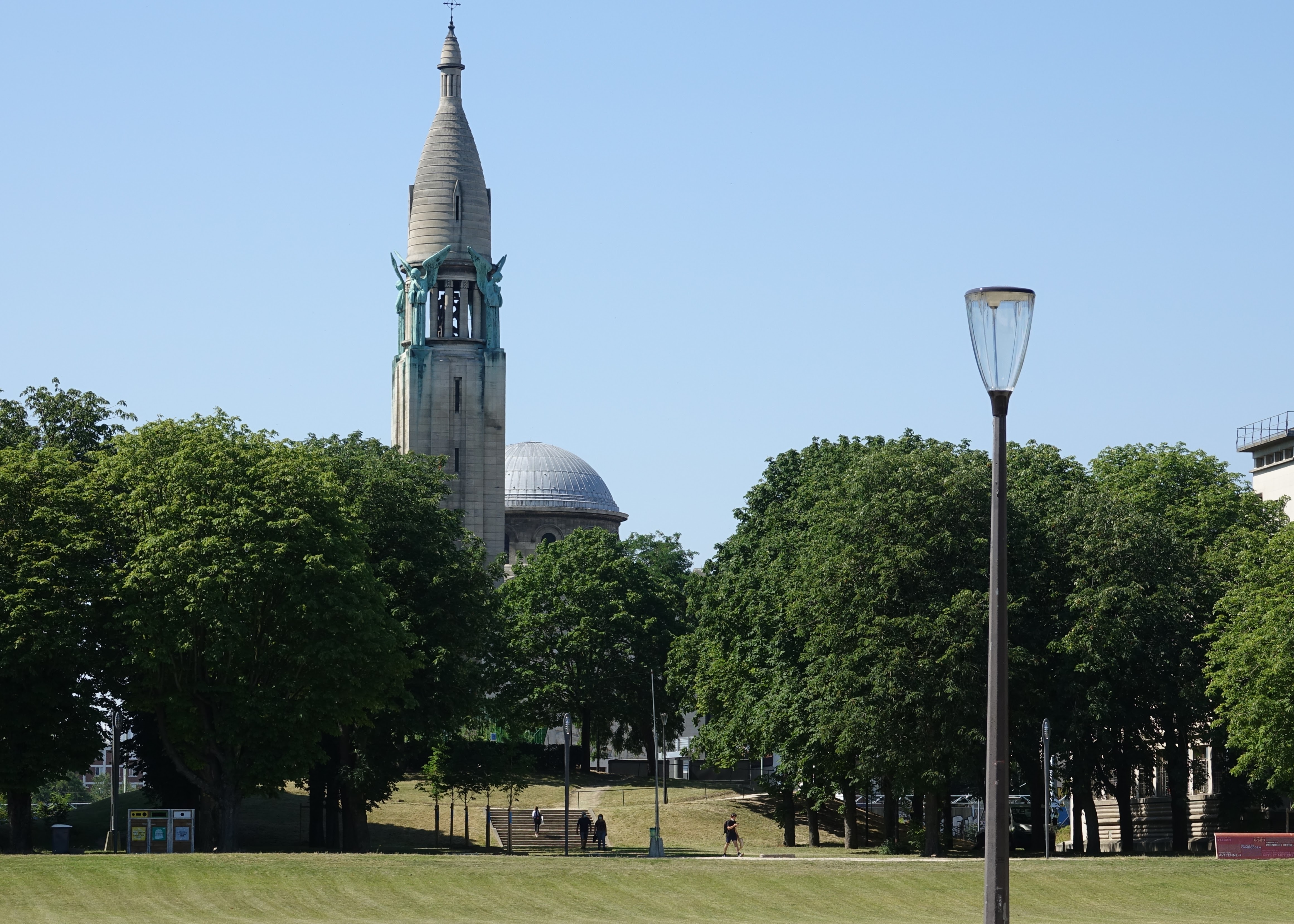 Patrick Modiano évoque dans Une Jeunesse, les bains de soleil sur l’immense pelouse de la Cité Universitaire bordée par l’église de Sacré-Cœur. Je connais bien cette église car elle est coincée au bord de l’autoroute A6. Quand je la vois, je sais que le voyage est fini, qu’on est arrivés ! Mais jamais je ne suis allée la voir. l’église est trop associée au bruit de l’autoroute, à l’odeur d’essence, aux embouteillages. Aujourd’hui, il me suffirait de prendre une passerelle au bout du parc pour voir de près les anges de bronze du clocher.