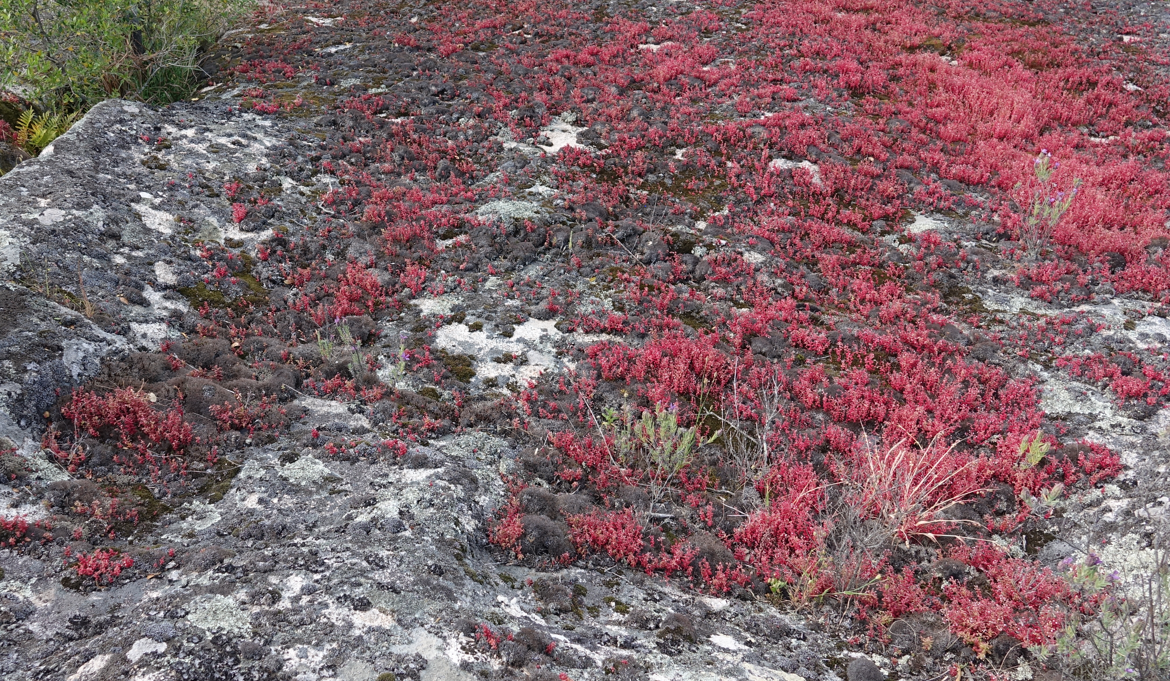 Près du village de T., on peut escalader de grandes plaques de granite, fleuries de plantes grasses d’un rouge pourpre, des sedum pourpiers, je crois (sedum moronense, confirme la flore ).