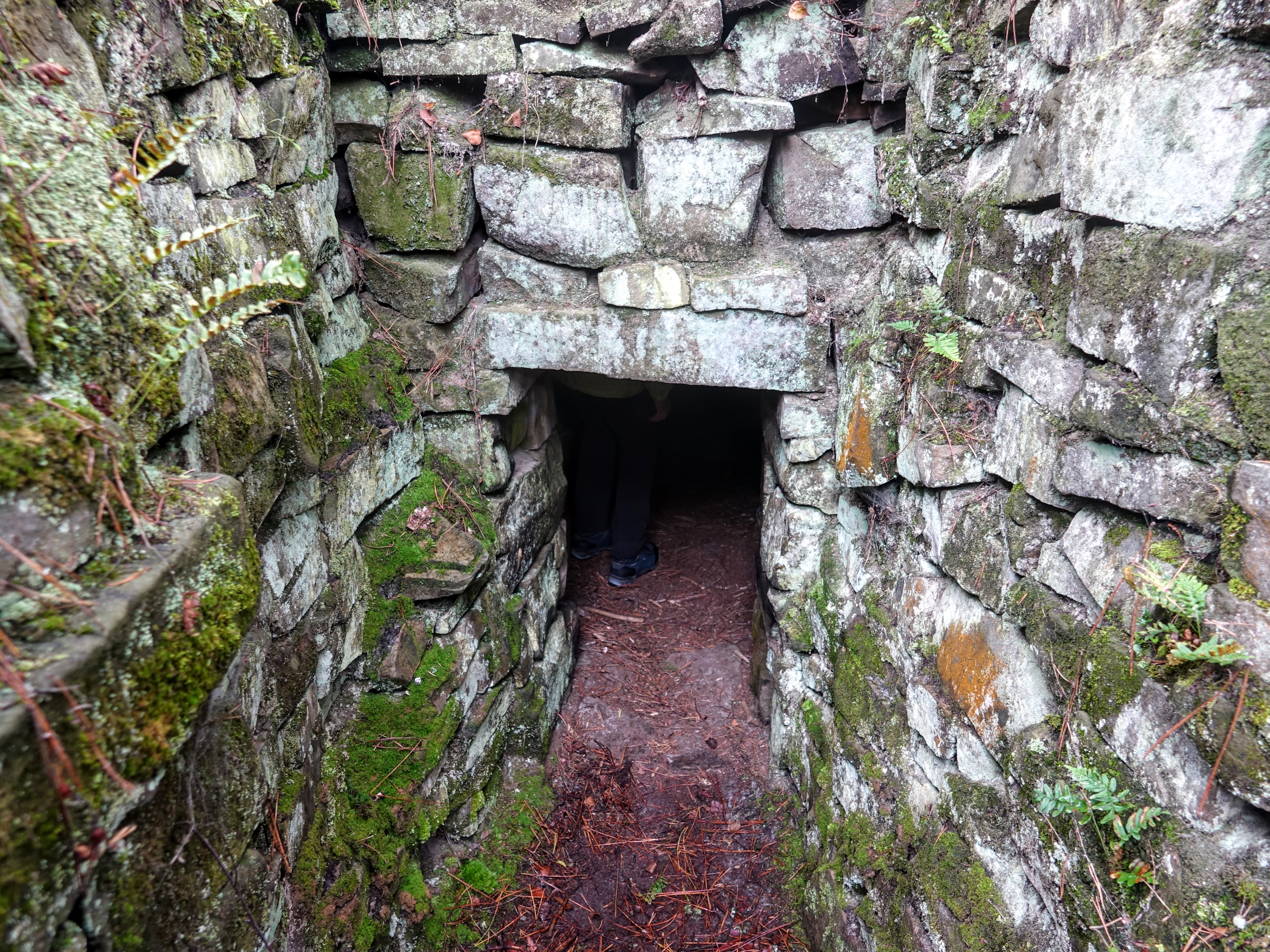 Intérieur d’un abri avec sa cheminée. Une pancarte prévient : Vestige archéologique. Prière de le respecter