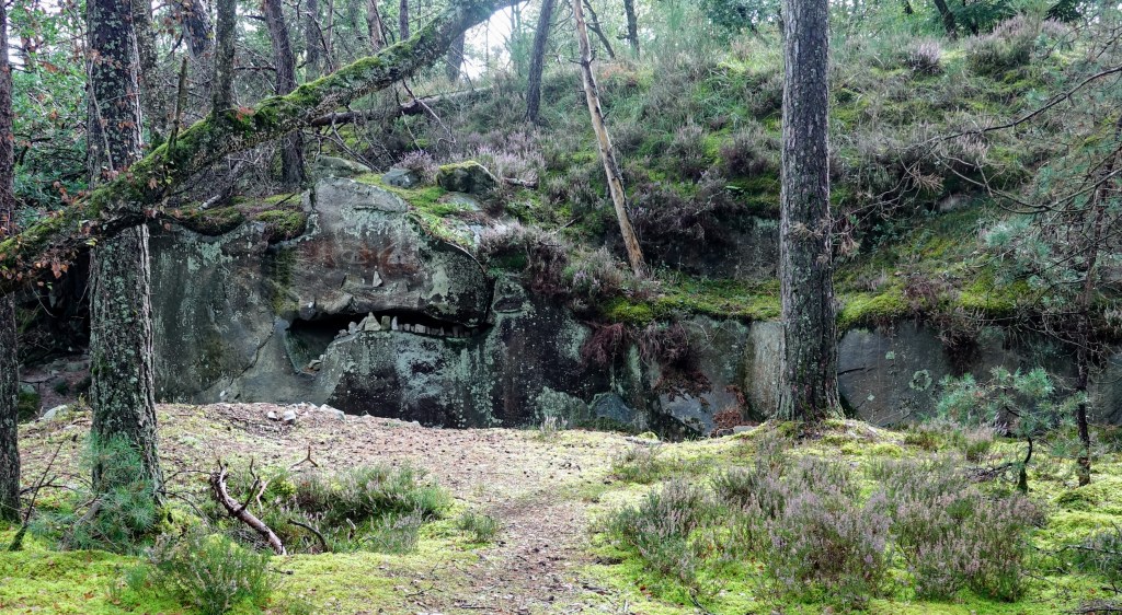 Les voies pavées que nous traversons ne sont pas toujours celles qui ont été utilisées pour transporter le grès. Ces voies de vidange, des chemins empierrés pour permettre aux roues des charrettes de ne pas s’enfoncer, avaient parfois une bande de sable au milieu car les sabots du cheval avaient plus d’adhérence sur le sable. Mais les allées pouvaient servir aux attelages des dames qui suivaient les chasseurs lors des grandes chasses à courre dans la forêt royale ou bien sûr au transport du bois.