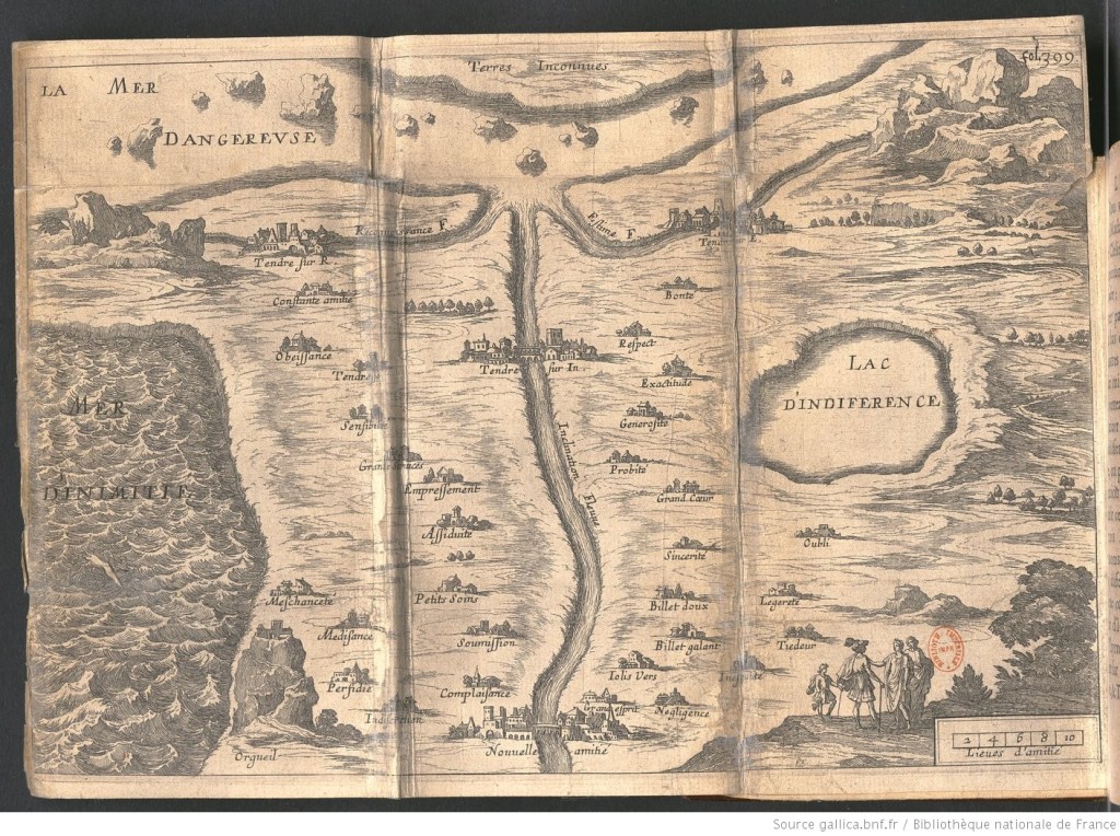 Près de Fontainebleau, la cour du roi Louis Philippe (1830-1848) s’est amusée à nommer les sentiers qui tournent autour du rocher des Demoiselles. Ce rocher s’appelait plus vulgairement rocher des Putains depuis le règne de Louis XV, où on avait exilé hors du parc du château les prostituées qui y exerçaient leur métier. Désormais, les hommes se rendaient en lisière de la forêt. Que pouvaient faire les dames de la cour, sinon sourire et tirer profit de leurs lectures de la Clélie de Mademoiselle de Scudéry ? On se promène aujourd’hui dans cette « Carte du Tendre »…