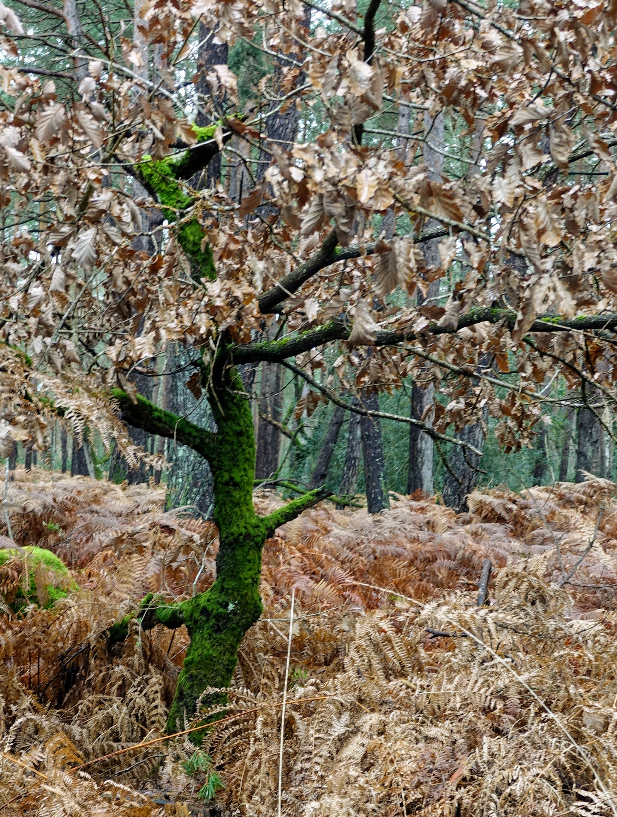 Il n’y a que les fougères et les chênes qui gardent leur couleur d’automne. Je ne sais pas pourquoi ils conservent leurs feuilles, mais le résultat est là : leurs teintes chocolat coïncident avec notre besoin de boisson chaude.