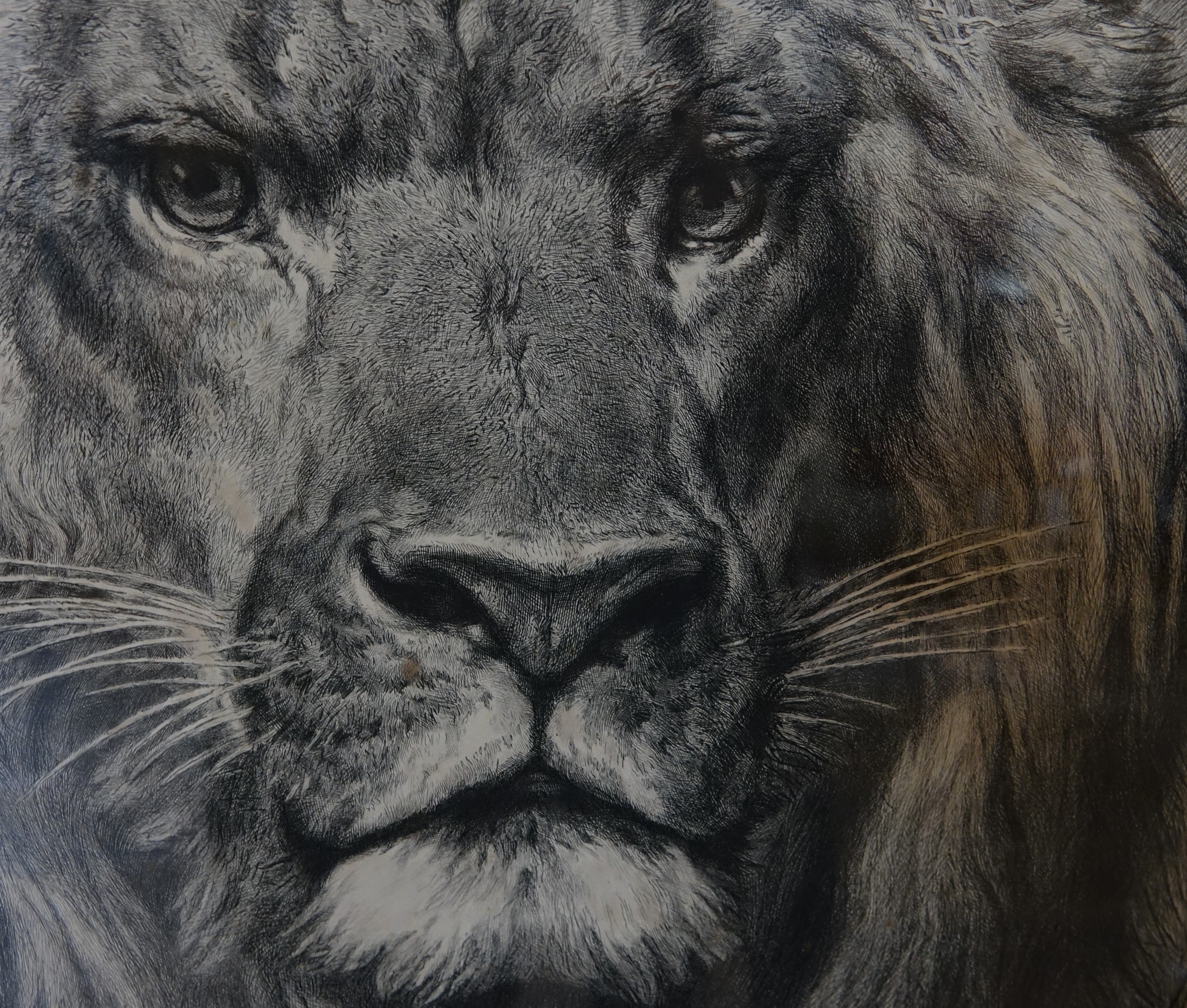 Les reflets empêchent de photographier un âne touchant, mais le regard pénétrant du lion a la même qualité. Le lion échange un regard avec le spectateur en partenaire et non comme un animal donné à voir.