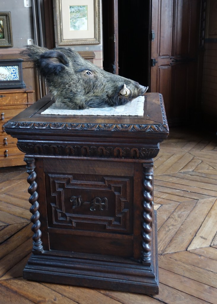 Dans cette vaste pièce, sont entassés des meubles, le piano où jouait Annette Micas, des commodes et des guéridons. Partout, des animaux vous regardent de leurs gros yeux de verre. Sur les murs, des têtes de chevaux, l’ara empaillé, des cornes de mouflons, des trophées de cerfs… Par terre, un crocodile, la peau tannée de la lionne Fathma avec sa tête naturalisée… L’ensemble fait davantage penser à un rendez-vous de chasse ou à un musée des arts taxidermiques qu’à l’atelier d’un peintre. On est mal à l’aise avant de comprendre que l’animal mort, évidé et naturalisé n’est pas exhibé comme un « autre », mais conservé comme un proche avec qui les liens ne peuvent être rompus.