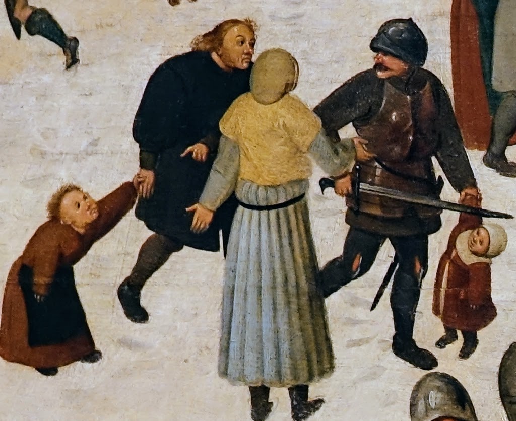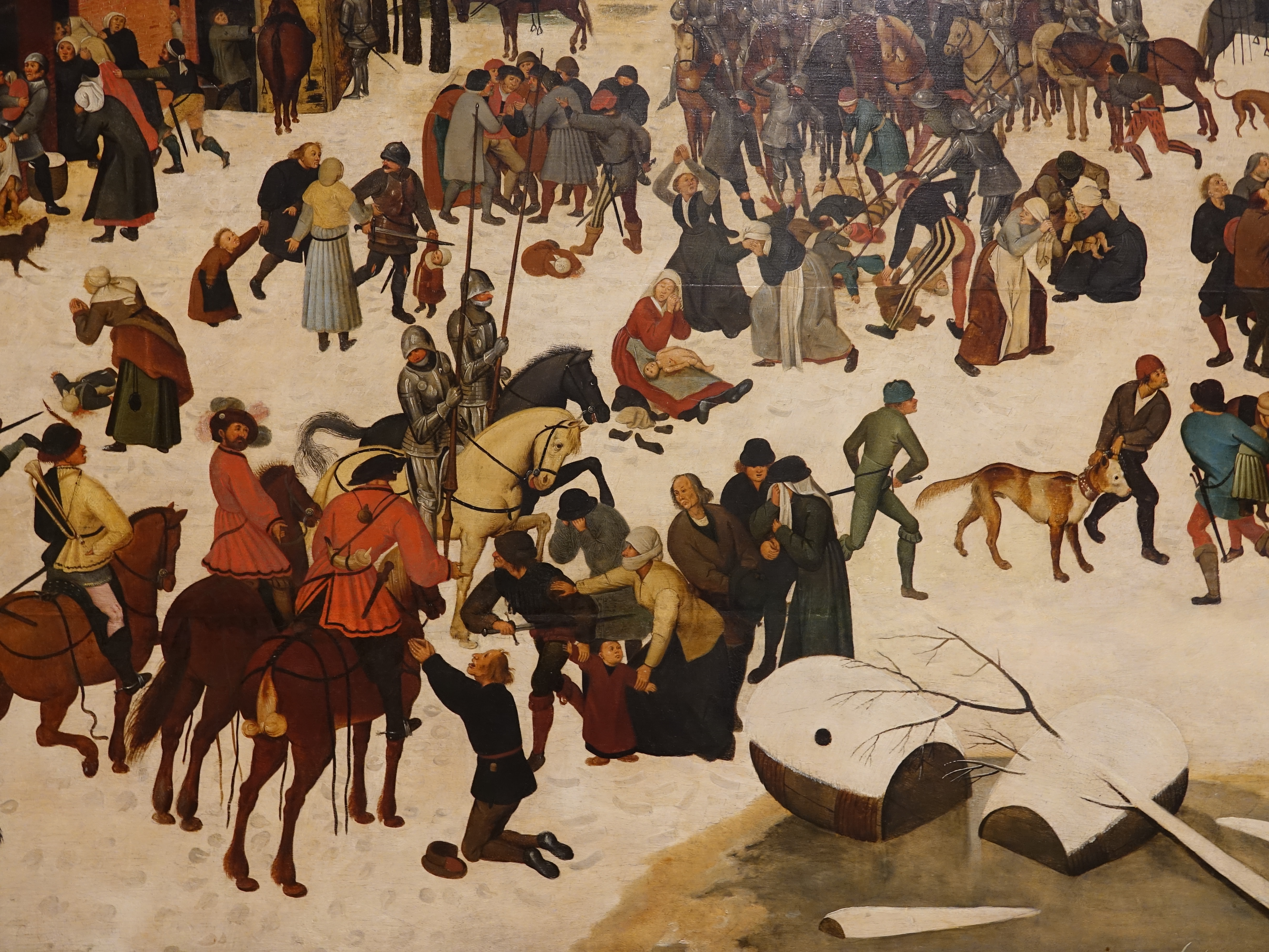 Vers la gauche du tableau, un couple discute avec un soldat qui a déjà saisi leur bébé, mais qui se retourne pour écouter ce qu’ils essaient de négocier. Le père traîne sa fille par le bras. Son index pointe vers la fillette qui résiste : « Prenez la fille et épargnez le garçon ». C’est la première fois que je discerne l’index de ce père qui, en sacrifiant sa fille, espère sauver son fils. Le triomphe du mal, c’est aussi d’entraîner les gens ordinaires à des choix terrifiants. Autant et plus que la structure d’ensemble du tableau, ce sont tous ces épisodes qui composent Le Massacre des Innocents. Le dispositif de Bruegel consiste à montrer les récits minuscules et abominables qui donnent le sens de ce qui se passe.