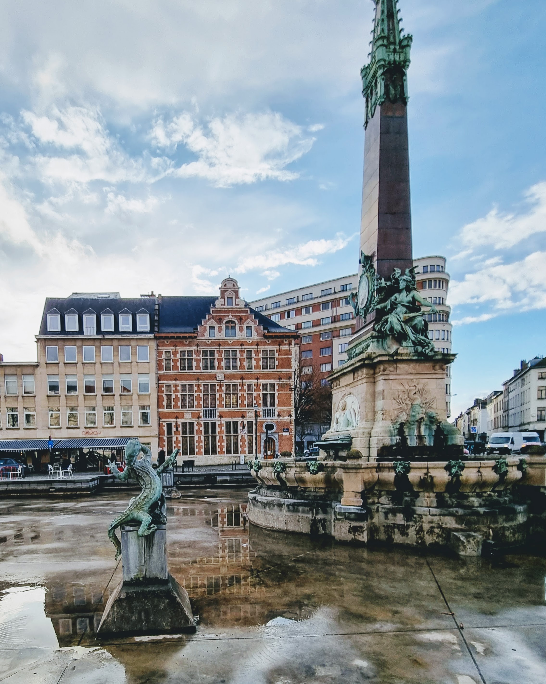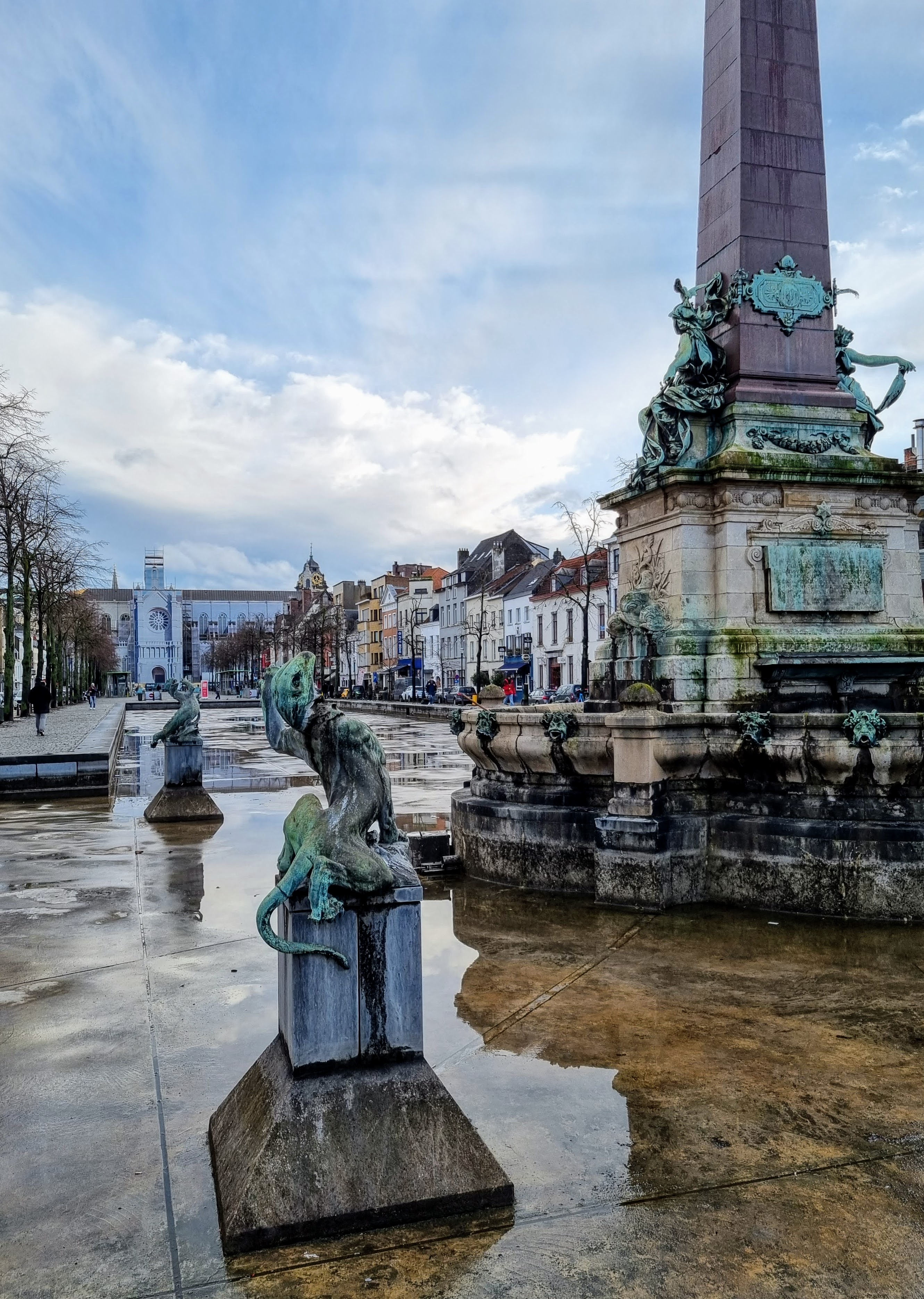 Place sainte Catherine, la fontaine Anspach, ses lézards géants ou crocodiles, ses griffons à tête de chien. Nous étions si occupés avec les animaux que n’avons pas levé les yeux vers les allégories féminines disposées autour de l’obélisque.