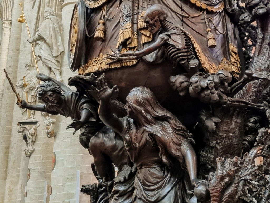 C’est un beau bâtiment, un peu massif, qui ne soulève pas l’enthousiasme, mais voici qu’on arrive devant une chaire baroque. On appelait chaire de vérité cette chaire de la cathédrale avec sa représentation théâtrale et dramatique d’Adam et Eve chassés du paradis :