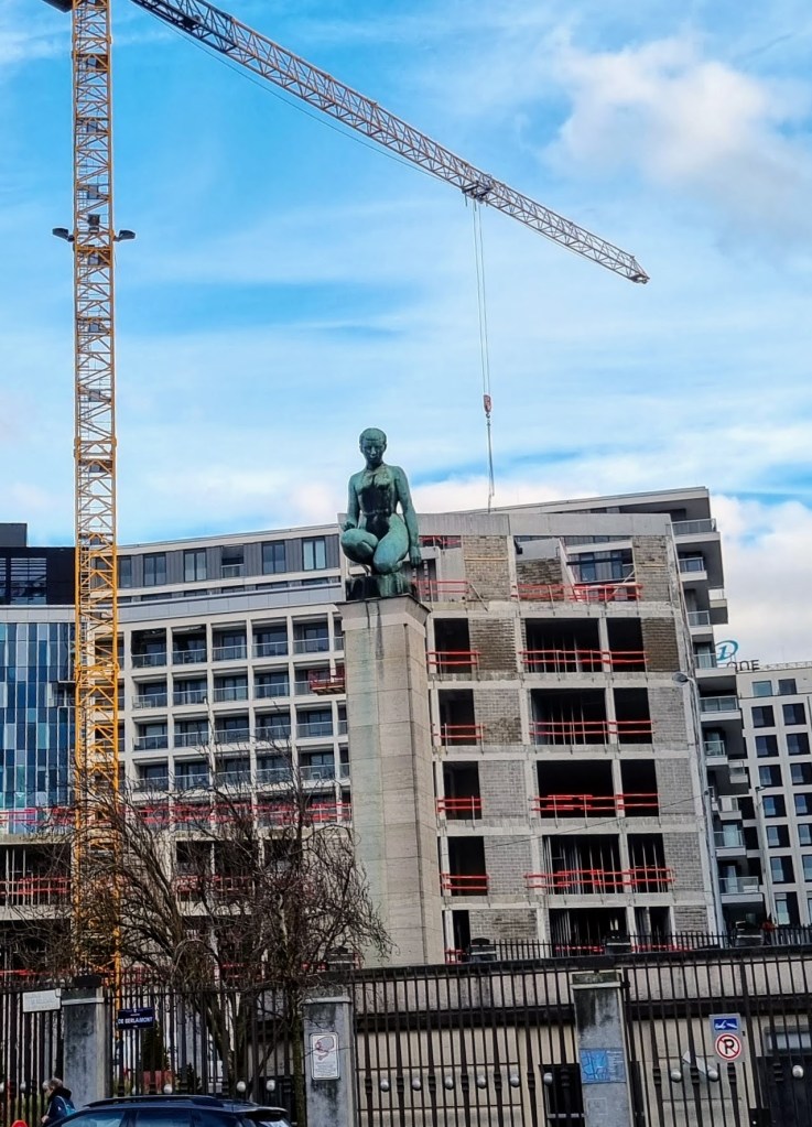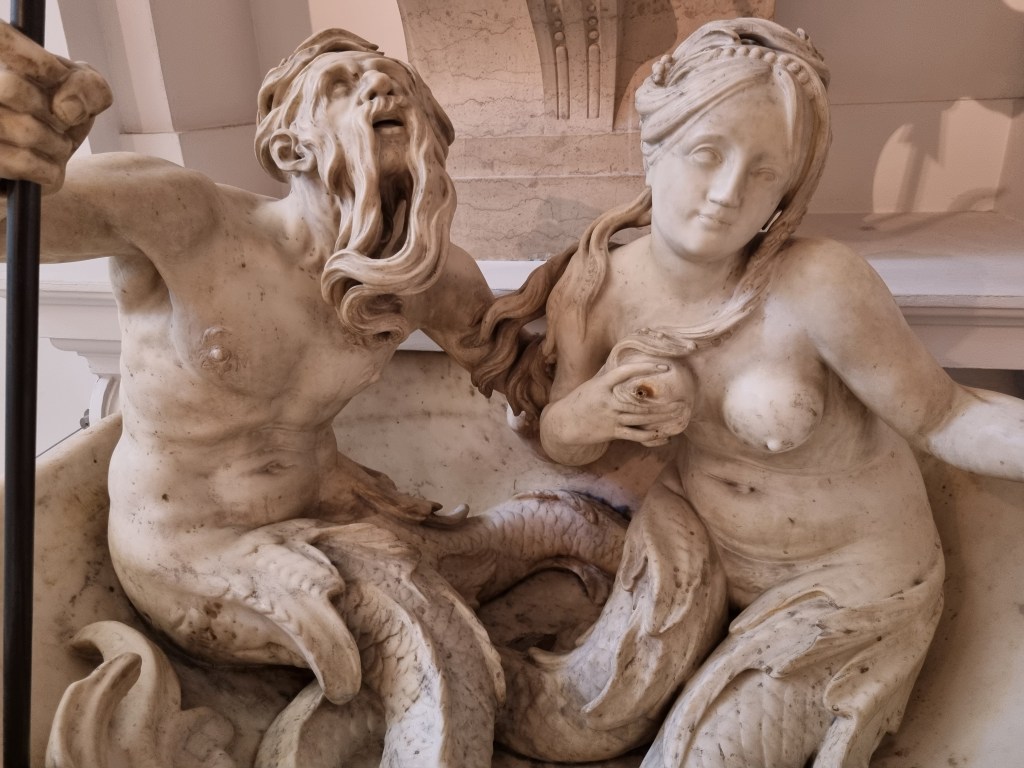 Je ne sais plus quelle Amphitrite et quel triton sont représentés dans cette fontaine placée en bas de l’escalier principal, mais j’ai pris la photo à cause du trou qui perce le sein par où l’eau devait couler… Les statues bruxelloises coulent par tous les orifices !