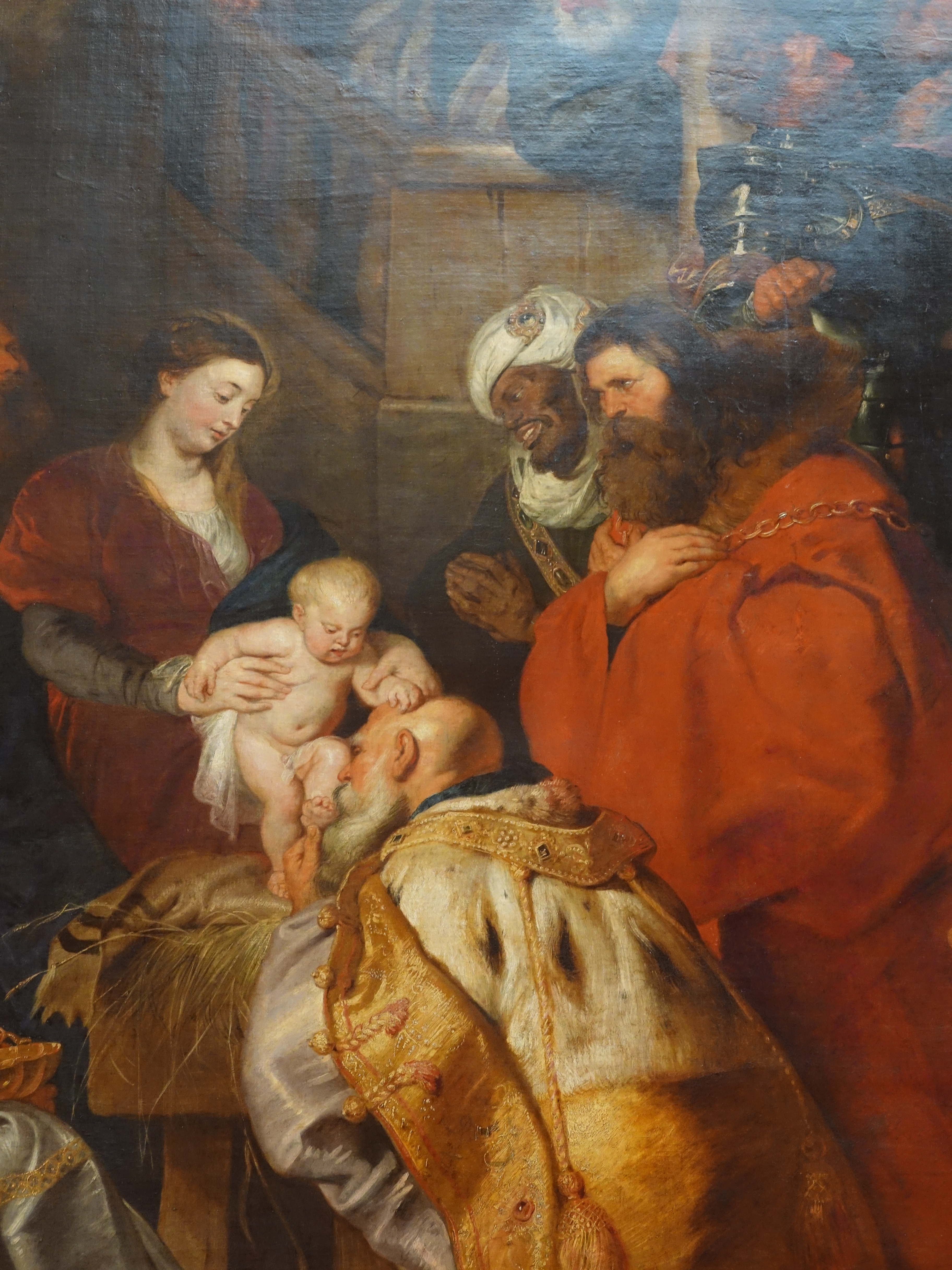 Il aurait peut-être mieux valu expliquer sur un cartel que « nègre » n’avait pas de valeur insultante à l’époque de Rubens, mais le tabou nord-américain l’a une fois de plus emporté. Le musée craint que la communauté africaine de Belgique trouve la nouvelle dénomination tout aussi offensante… Il ferait mieux de souligner la place qu’occupait la représentation d’un Africain dans toutes les Adorations des rois mages peintes par Rubens. Voici un détail de celle de Bruxelles !