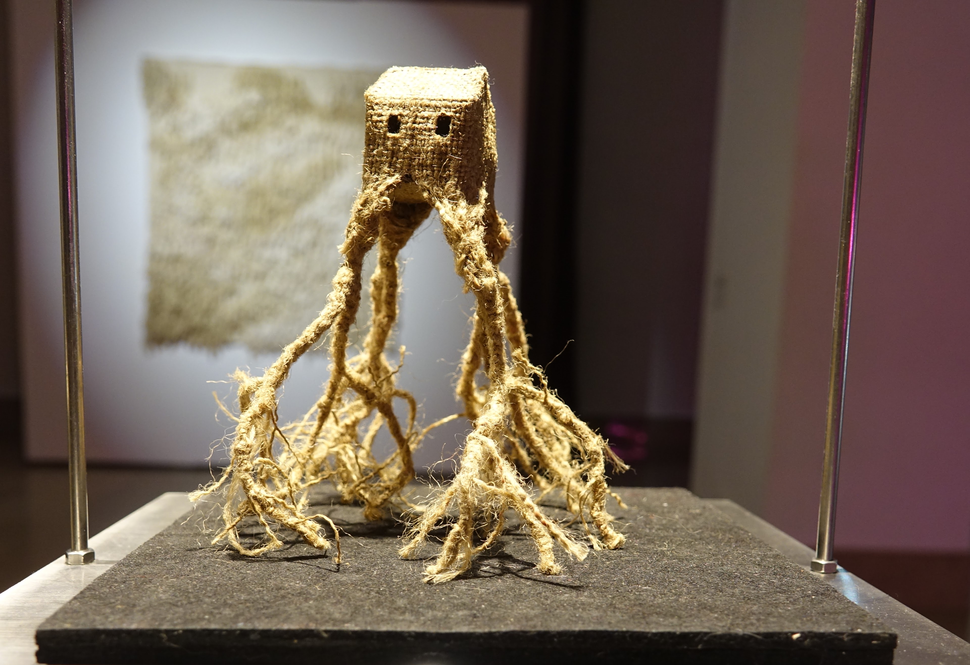 L’évolution des matériaux permet de détacher les petits formats des murs et d’en faire des objets plus proches de sculptures que de tentures ou de tapis. Certains sont amusants proches des jouets d’enfants, comme cette maison quadrupède, confectionnée avec du jute.