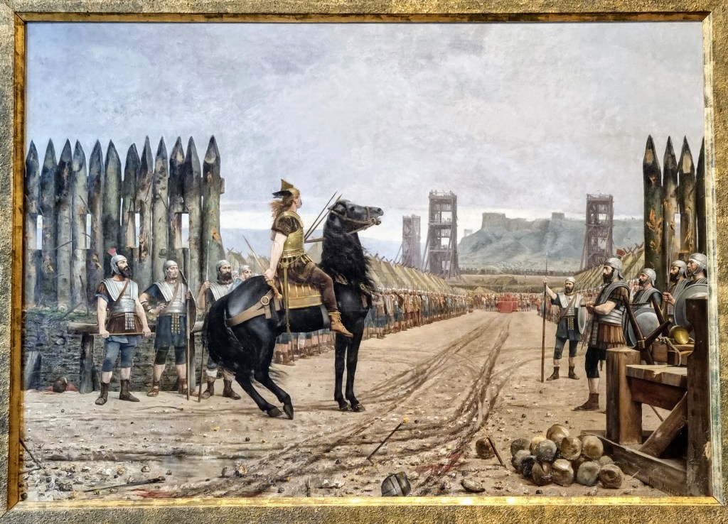 Le 19e siècle a beaucoup aimé les tableaux où Vercingétorix, malheureux au combat, surpasse son vainqueur par sa dignité héroïque. Moins célèbre que le tableau de Royer dont la reproduction ornait les manuels scolaires après la défaite de 1871 contre les Allemands et qui est aussi dans le musée, le tableau de H.P. Motte développe la même thématique de la grandeur dont les Français font montre jusque dans la défaite. Ici, le vaincu domine les vainqueurs repoussés dans les marges du tableau. On ne voit même pas César.