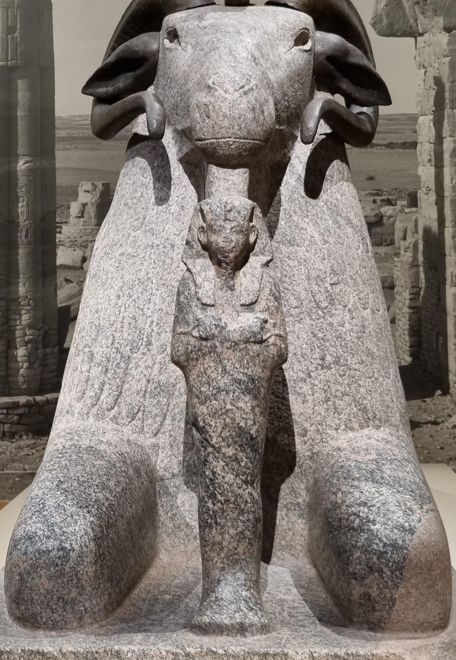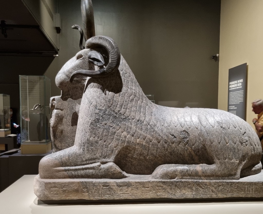La sculpture monumentale d’un bélier réunit tout ce que j’aime de l’Egypte ancienne, la maîtrise des formes et des matériaux et, à travers ces couples formés d’un homme et d’un animal, les images énigmatiques du divin dans un temps où les animaux étaient puissants et les héros des nains blottis entre leurs pattes.