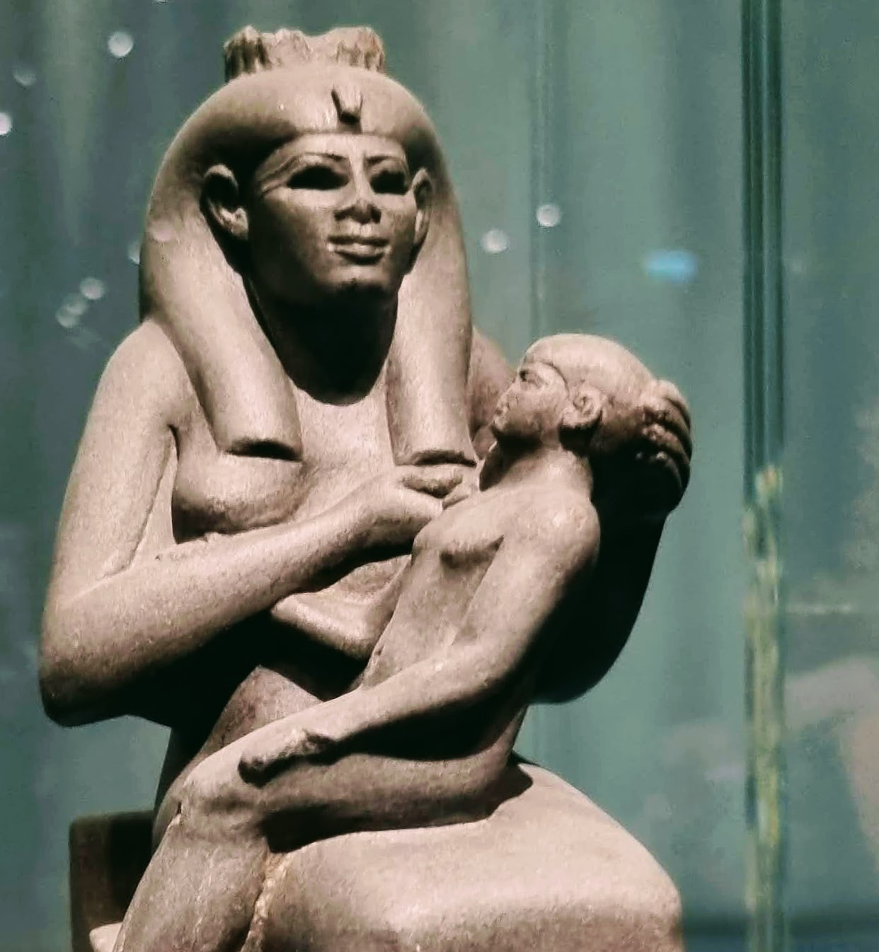 Cette statue n’est pas « jolie », mais elle m’a rappelée les innombrables représentations de mères qui donnent le sein. Les Vierges du lait du Moyen Age, la Vierge au sein rond de Fouquet, les jeunes femmes de Renoir et de Picasso me viennent à l’esprit… La statue d’Isis et de son fils Horus diffère par bien des aspects de ces œuvres qui ont presque codifié l’inclinaison tendre du cou de la mère, la main minuscule de l’enfant posée sur le sein. Mais les aspects essentiels sont là. La mère universelle offre le lait vital à l’enfant et cette scène ne cesse de faire retour dans l’histoire de la peinture.