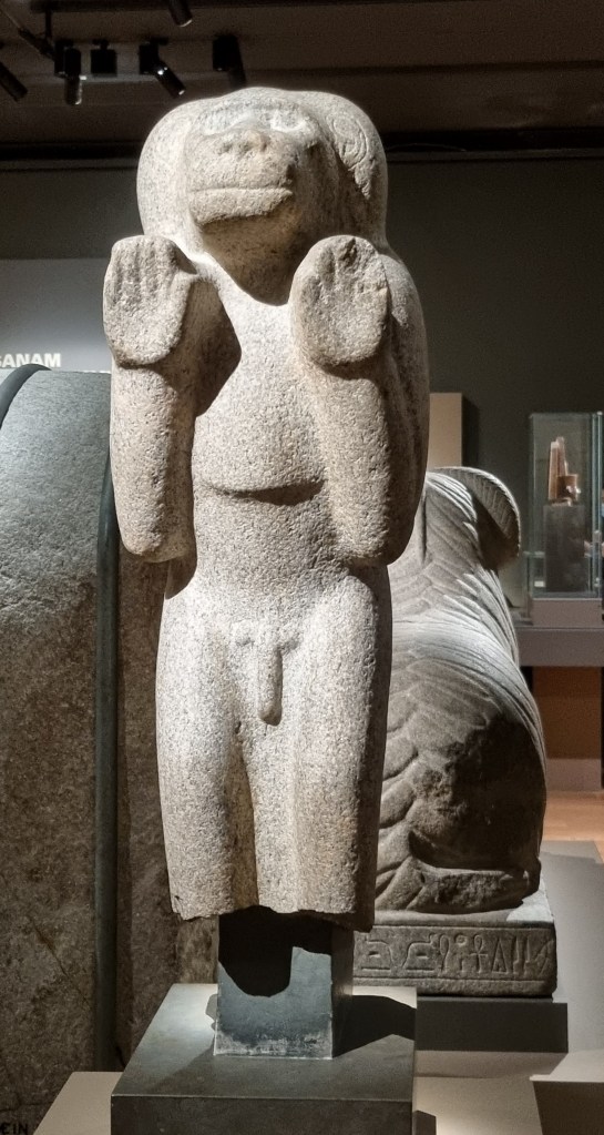 Une fois de plus, nous regardons, subjugués, les dieux égyptiens à tête d’animaux, Horus dieu- faucon, Sekhmet la lionne, protectrice du pouvoir royal, ou encore Thot, à tête d’Ibis ou de babouin (ici représenté par un babouin paumes levées, adorant le disque solaire). Ces représentations sont contradictoires, troublantes. Elles tournent le dos à la recherche du trompe l’œil qu’a si longtemps poursuivi l’art occidental, et imposent des mélanges « impossibles ». Et pourtant, elles le font de façon « réaliste ». Personne n’hésite à reconnaître les animaux. On identifie au premier coup d’œil le mufle du babouin. Les descriptions savantes résolvent ce paradoxe en invitant à ne pas voir l’animal dans les statues, seulement le système théologique abstrait qu’il est chargé d’incarner. Ainsi le babouin ne serait qu’un symbole de l’écriture et des sciences. Cependant, n’en déplaise aux spécialistes de la religion, la représentation impose la présence de l’animalité, la nature mixte des dieux, avec sa part humaine et sa part divine (ce que dit le livre de Françoise Dunand et Roger Lichtenberg). Le vérisme est si fort que les statues de quatre babouins, accolées primitivement à la base de l’obélisque de la Concorde, ont choqué le roi Louis-Philippe qui les a trouvées trop indécentes, avec leur sexe bien visible, pour orner la place