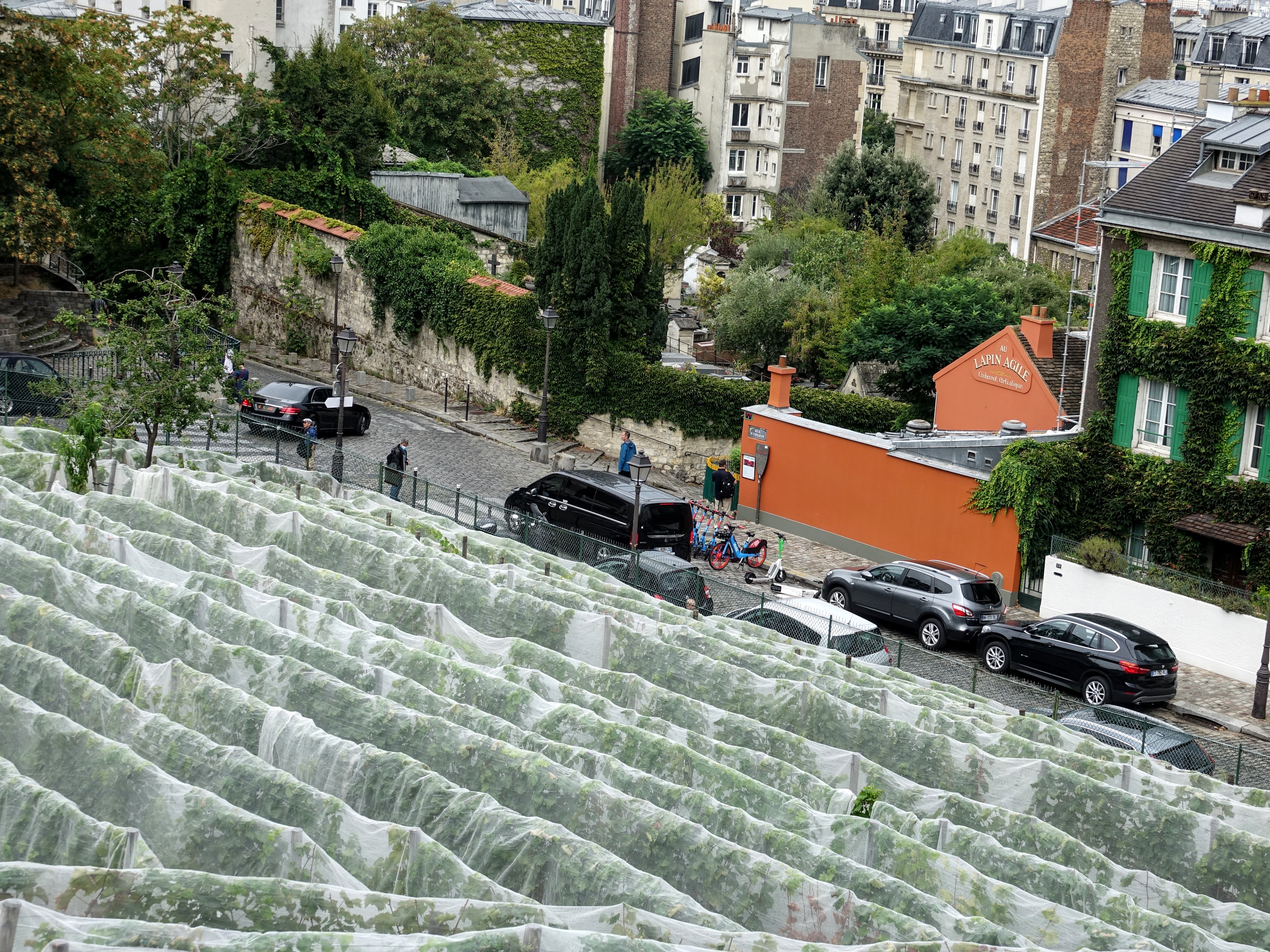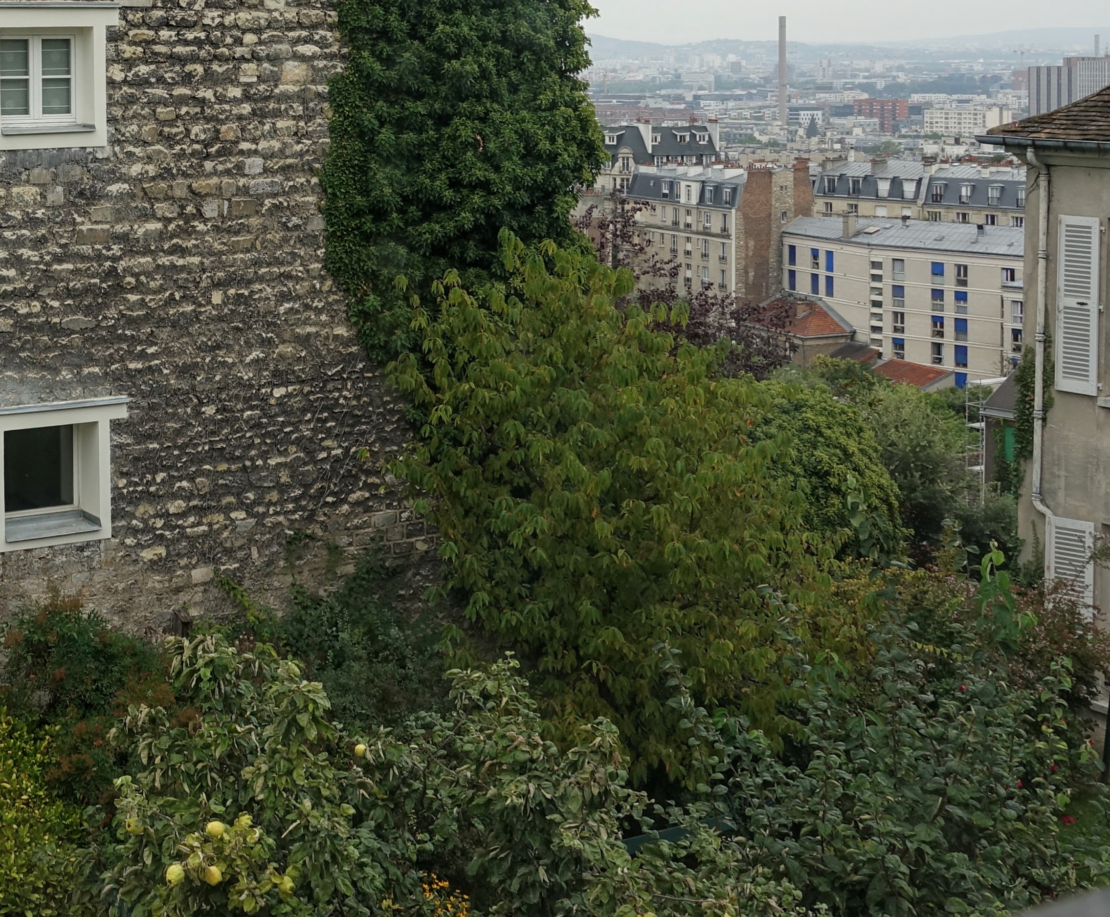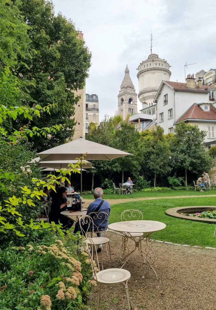 Il faut imaginer l’endroit, à la lisière de Paris, quand il était encore entouré de bicoques en ruine, avec le carré de vignes de Montmartre, et le Lapin Agile. Par cette journée estivale, c’est un havre de paix. On s’assied autour d’une des petites tables de jardin. On mange pour pas trop cher une salade de pâtes dont le nom « à l’italienne » promet davantage que le résultat : une plâtrée de pâtes avec trois feuilles de roquettes et de minuscules bouts de tomates et de jambon. Mais il fait bon ; on entend vaguement les bruits assourdis des conversations des tables voisines. On se sent loin.
