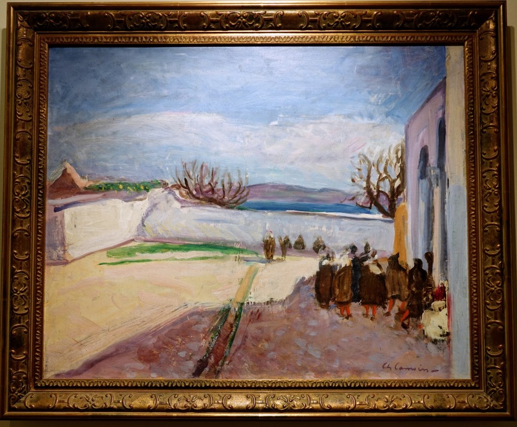 C’est la même recherche que l’on retrouve dans les Marocains dans une rue. Une large bande claire anime la couleur prune des collines reprise en plus sombre par l’ombre du premier plan, sans qu’il soit besoin de notes violentes. Après, il ne reste qu’à guider le regard par des lignes obliques, murs, groupes de personnages, pour aller du premier plan vers la profondeur du tableau.