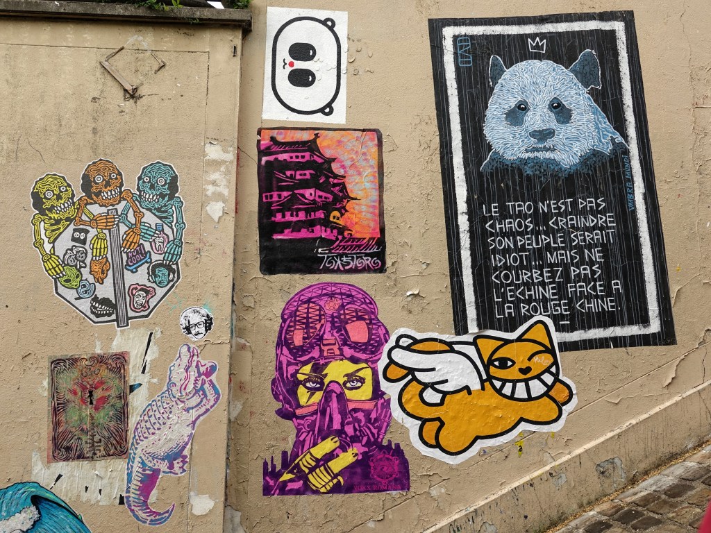 En haut de l’escalier, on est accueillis par le chat hilare qui couvre les murs des quartiers populaires de Paris, par un ours méditatif tenant un discours inspiré de Lao Tseu et par quelques dessins mêlant fantastique et géométrie. Une autre fois, je reviendrai pour voir si ces personnages se promènent ailleurs dans Montmartre.