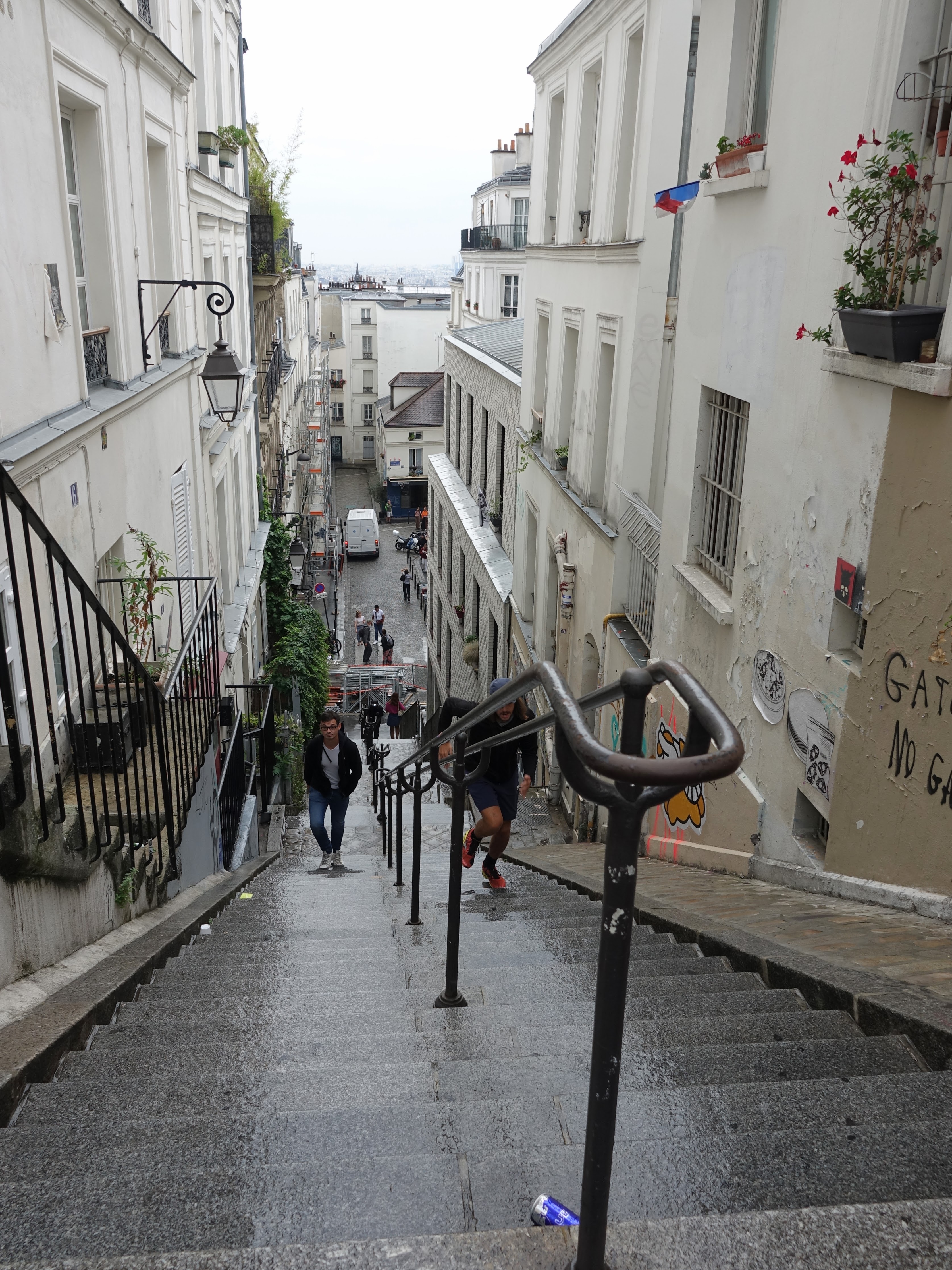 Depuis la station Barbès-Rochechouart, le chemin qui mène au sommet de la butte est bien raide. L’appellation Escalier du Calvaire, appelle inévitablement des plaisanteries sur ce nom… « Calvaire, oui, calvaire du piéton ! ».