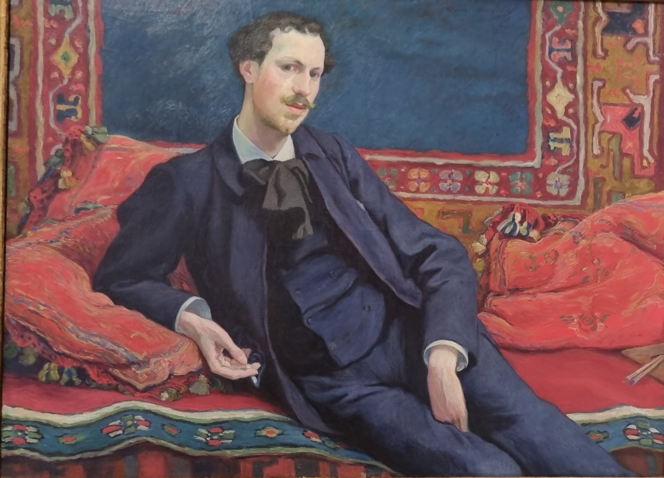 Le musée Fabre est idéal. Il n’est pas trop fréquenté. Il a un fond classique étoffé et des collections importantes de Bazille, de Courbet et de Soulages. C’est l’occasion de s’arrêter devant des peintres que j’ai croisés par hasard lors d’expositions. Ainsi Georges-Daniel de Monfreid, le père de l’écrivain baroudeur qui a fait rêver les adolescents d’après-guerre. J’ai aimé son portrait de fillette lors de l’expo pastel d’Orsay et voici le portrait d’un ami, René Andreau. On connaît Monfreid en tant qu’ « ami fidèle de Gauguin ». Pour la deuxième fois, je m’enchante de ses couleurs, ici des rouges orientaux. Peut-être, l’attitude du modèle n’était-elle pas jugée assez virile ? Elle devient regardable en 2023.