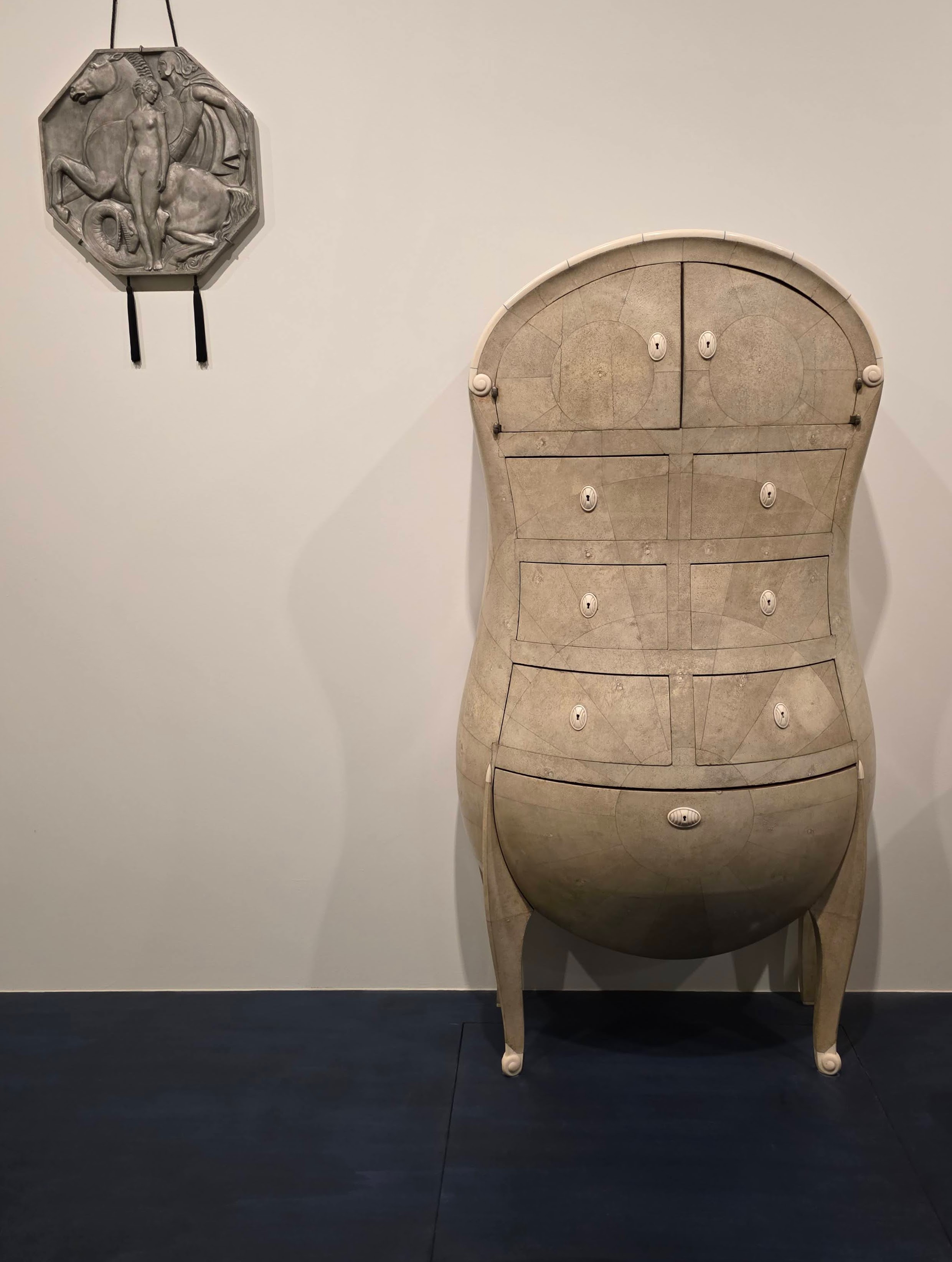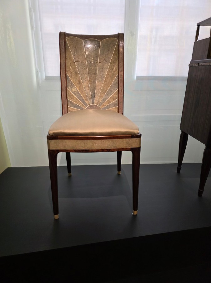 C’est aussi de ce projet d’ambassade que provient le chiffonnier aux belles hanches d’André Groult. « Il est réalisé en galuchat, explique la guide ».J’ignorais tout du galuchat jusqu’à cette visite… J’ai adoré ce mot galuchat situé quelque part entre galoche et galurin qui est tombé dans mon oreille. Il m’a ravie avant même d’en comprendre le sens. Il s’agit du cuir de poisson, en particulier de la partie ventrale de la roussette, dont les écailles hérissées de pointes rendent indispensable un ponçage énergique. Après ce travail, le cuir est très lisse.