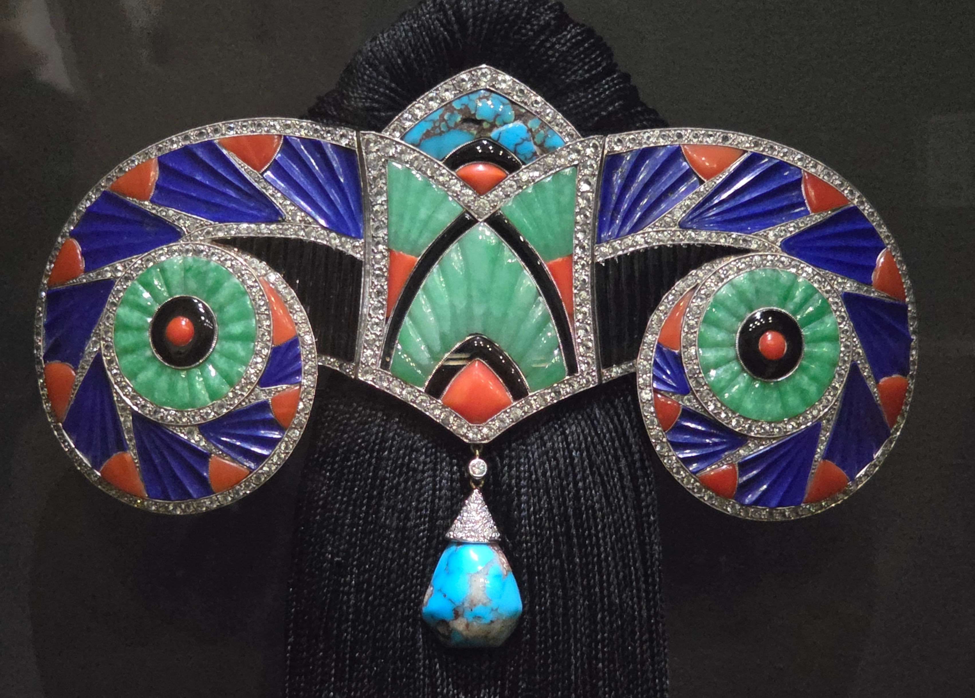 Un peu plus loin la broche de corsage de Boucheron ornée d’un pompon de soie et de pierres dures (lapis, corail, onyx, jade, turquoise) s’inspire de motifs égyptiens. Le mode de l’orientalisme coexistera avec des influences plus lointaines d’Extrême-Orient et d’Afrique.