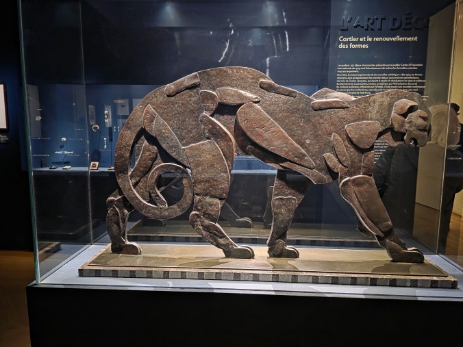 Une panthère de fer forgé garde une salle entière consacrée à Cartier. Ici, le luxe s’adapte au deuil. Les veuves de guerre renoncent aux couleurs, mais pas à l’éclat. Le noir et blanc de Cartier respecte les contraintes, préserve l’envie d’élégance.