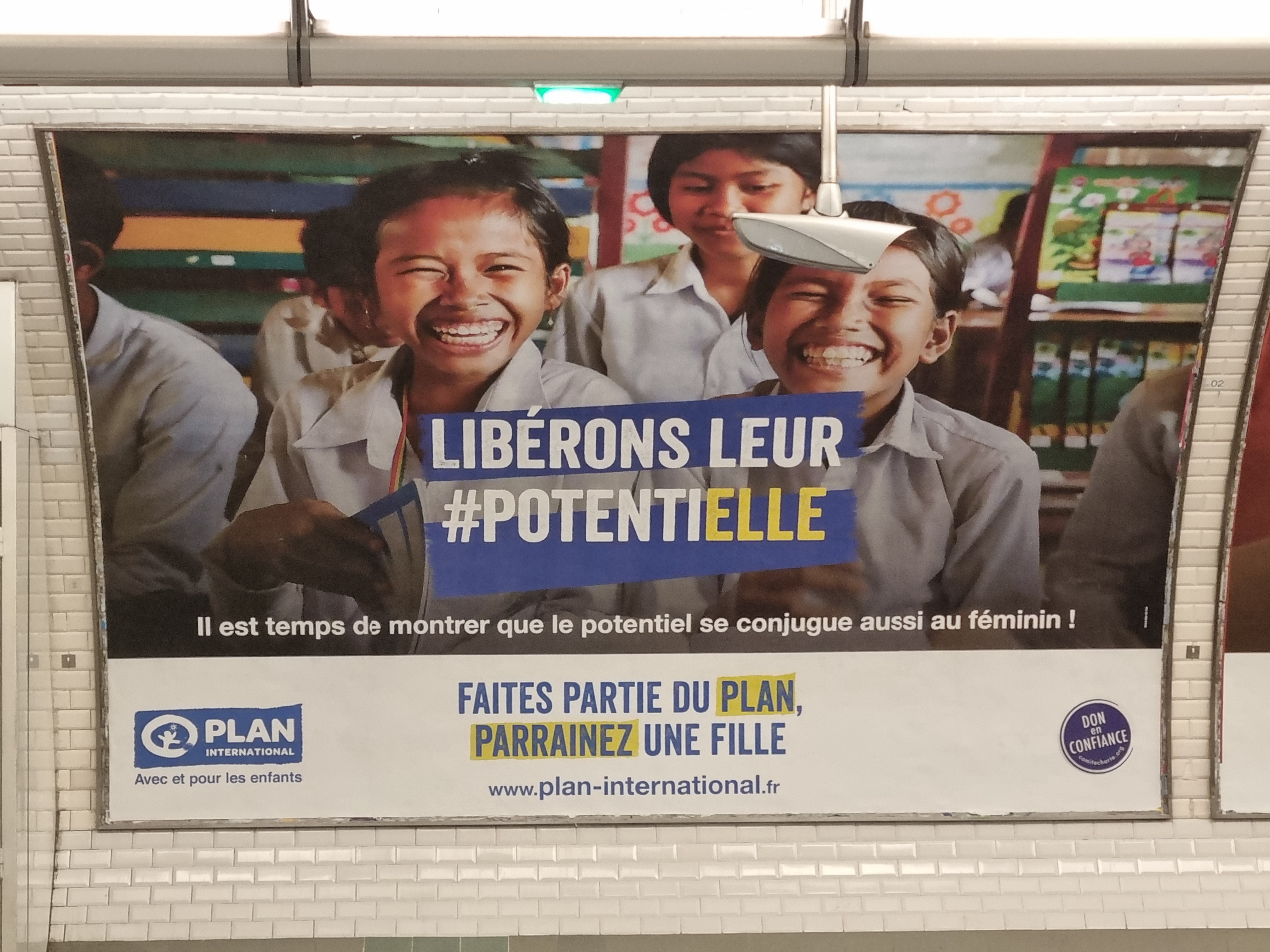 De fait un jeu de mot ne menace pas le français écrit et il attire l’œil efficacement. Si je l’ai signalé, c’est qu’il me paraît symptomatique de la schizophrénie actuelle. Mes lecteurs trouvent sympa d’afficher dans l’espace public un message qui s’adresse à ceux qui ont des yeux pour voir (qui connaissent suffisamment le code pour jouir de sa transgression). La publicité « n’est pas destinée aux jeunes (pauvres encore) mais aux vieux (riches!) futurs donateurs. Je la trouve plutôt réussie. « Positivons »! Comme nous le recommandent d’autres publicités, écrit Marianne… Certes, mais la publicité est quand même vue par tous et une part croissante des usagers du métro ne la comprend pas ce qui introduit une curieuse partition dans le public.